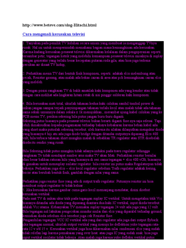 Daftar kerusakan tv. Bagian 3 AKARI- IC 14M88R Regulator tidak bekerja: Cek transitor tegangan optocoupler. AKARI- IC 1437RMD Regulator tidak bekerja: Cek dioda zener ZD812 (18v), C815 (100uf/25v) dan C820 (1uf/100v) ganti jika perlu. SABA-MF3F02 Tidak berwarna (hitam putih), picture oke: Cek LC02 (pin 36 M52038) dan capasitor 47pf. TELESONIC- TC5191GR Power on, Relay on, seharusnya standby: Cek C120 (22uf/50v) di kaki basis Transistor TR113 JOHNSONS- (TA 7698) Warna membelobor: Cek elco 1uf/50v di pin 6 SAMSUNG- CB3366Z SMR 40000 Rusak, setelah di ganti rusak lagi: ganti dulu modul driver HIS 6169 Auto Program bisa, memori, Adjust, vertikal, Horizontal, RGB tidak berfunsi : Ganti Eprom 24C04 DAZZ-DZ2570A Tidak mau star : Cek tegangan kaki basis Transistor Horizontal, normalnya 8 volt DAEWOO- DMQ2044 OSD tidak ada, tapi panel berpungsi: Ganti IC program (M34300M4-230SP) FUJI ELECTRIC- (TA 8659, TA 8403) B+ naik sampai 300v: Cek elco 10uf/160v di pin 1 STR 58041. BALAUPUNK- CTV54158JK Matrix kacau (tidak bisa PAL): Cek R523 (10k) biasanya putus SONY- KV G14P1 Layar gelap, OSD ada: Cek ABL R857 (82K) SONY- KV1415GE Transistor Horizontal terlalu panas: Cek Horizontal OSC pin 27 dan ganti CXA1213BS AIWA-A205KER OSD tidak ada Vcc, cristal normal: Ganti M37220m3-150SP OSD hanya berwarna merah: ganti TA8759BN
