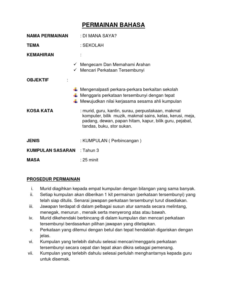 NAMA PERMAINAN TEMA KEMAHIRAN : DI MANA SAYA? : SEKOLAH : Mengecam Dan Memahami Arahan Mencari Perkataan Tersembunyi OBJEKTIF : Mengenalpasti perkara-perkara berkaitan sekolah Menggaris perkataan tersembunyi dengan tepat Mewujudkan nilai kerjasama sesama ahli kumpulan KOSA KATA : murid, guru, kantin, surau, perpustakaan, makmal komputer, bilik muzik, makmal sains, kelas, kerusi, meja, padang, dewan, papan hitam, kapur, bilik guru, pejabat, tandas, buku, stor sukan. : KUMPULAN ( Perbincangan ) : Tahun 3 : 25 minit