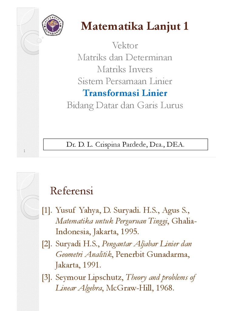 [1]. Yusuf Yahya, D. Suryadi. H.S., Agus S., Matematika untuk Perguruan Tinggi, GhaliaIndonesia, Jakarta, 1995. [2]. Suryadi H.S., Pengantar Aljabar Linier dan Geometri Analitik, Penerbit Gunadarma, Jakarta, 1991. [3]. Seymour Lipschutz, Theory and problems of Linear Algebra, McGraw-Hill, 1968.