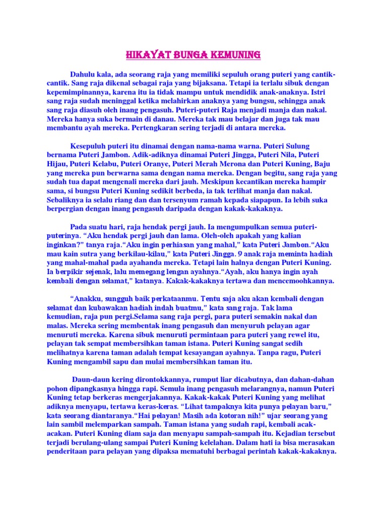 Kalian ini sungguh keterlaluan. Mestinya ayah tak perlu membawakan apaapa untuk kalian. Bisanya hanya mengganggu saja! Kata Puteri Kuning dengan marah.Sudah ah, aku bosan. Kita mandi di danau saja! ajak Puteri Nila. Mereka meninggalkan Puteri Kuning seorang diri. Begitulah yang terjadi setiap hari, sampai ayah mereka pulang. Ketika sang raja tiba di istana, kesembilan puterinya masih bermain di danau, sementara Puteri Kuning sedang merangkai bunga di teras istana. Mengetahui hal itu, raja menjadi sangat sedih. Anakku yang rajin dan baik budi! Ayahmu tak mampu memberi apa-apa selain kalung batu hijau ini, bukannya warna kuning kesayanganmu! kata sang raja. Raja memang sudah mencari-cari kalung batu kuning di berbagai negeri, namun benda itu tak pernah ditemukannya.Sudahlah Ayah, tak mengapa. Batu hijau pun cantik! Lihat, serasi benar dengan bajuku yang berwarna kuning, kata Puteri Kuning dengan lemah lembut.Yang penting, ayah sudah kembali. Akan kubuatkan teh hangat untuk ayah, ucapnya lagi. Ketika Puteri Kuning sedang membuat teh, kakak-kakaknya berdatangan. Mereka ribut mencari hadiah dan saling memamerkannya. Tak ada yang ingat pada Puteri Kuning, apalagi menanyakan hadiahnya. Keesokan hari, Puteri Hijau melihat Puteri Kuning memakai kalung barunya. Wahai adikku, bagus benar kalungmu! Seharusnya kalung itu menjadi milikku, karena aku adalah Puteri Hijau! katanya dengan perasaan iri.Ayah memberikannya padaku, bukan kepadamu, sahut Puteri Kuning. Mendengarnya, Puteri Hijau menjadi marah. Ia segera mencari saudara-saudaranya dan menghasut mereka. Kalung itu milikku, namun ia mengambilnya dari saku ayah. Kita harus mengajarnya berbuat baik! kata Puteri Hijau. Mereka lalu sepakat untuk merampas kalung itu. Tak lama kemudian, Puteri Kuning muncul. Kakak-kakaknya menangkapnya dan memukul kepalanya. Tak disangka, pukulan tersebut menyebabkan Puteri Kuning meninggal.Astaga! Kita harus menguburnya! seru Puteri Jingga. Mereka beramairamai mengusung Puteri Kuning, lalu menguburnya di taman istana. Puteri Hijau ikut mengubur kalung batu hijau, karena ia tak menginginkannya lagi. Sewaktu raja mencari Puteri Kuning, tak ada yang tahu kemana puteri itu pergi. Kakak-kakaknya pun diam seribu bahasa. Raja sangat marah. Hai para pengawal! Cari dan temukanlah Puteri Kuning! teriaknya. Tentu saja tak ada yang bisa menemukannya. Berhari-hari, berminggu-minggu, berbulan-bulan, tak ada yang berhasil mencarinya. Raja sangat sedih. Aku ini ayah yang buruk, katanya. Biarlah anak-anakku kukirim ke tempat jauh untuk belajar dan mengasah budi pekerti! Maka ia pun mengirimkan puteri-puterinya untuk bersekolah di negeri yang jauh. Raja sendiri sering termenung-menung di taman istana, sedih memikirkan Puteri Kuning yang hilang tak berbekas. Suatu hari, tumbuhlah sebuah tanaman di atas kubur Puteri Kuning. Sang raja heran melihatnya. Tanaman apakah ini? Batangnya bagaikan jubah puteri, daunnya bulat berkilau bagai kalung batu hijau, bunganya putih kekuningan dan sangat wangi! Tanaman ini mengingatkanku pada Puteri Kuning. Baiklah, kuberi nama ia Kemuning.! kata raja dengan senang. Sejak itulah bunga kemuning mendapatkan namanya. Bahkan, bunga-bunga kemuning bisa digunakan untuk mengharumkan rambut. Batangnya dipakai untuk membuat kotak-kotak yang indah, sedangkan kulit