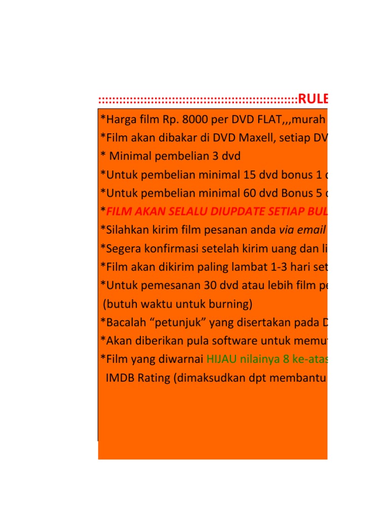 *Harga film Rp. 8000 per DVD FLAT,,,murah banget deeh *Film akan dibakar di DVD Maxell, setiap DVD akan di isi * Minimal pembelian 3 dvd *Untuk pembelian minimal 15 dvd bonus 1 dvd berlaku *Untuk pembelian minimal 60 dvd Bonus 5 dvd berlaku *FILM AKAN SELALU DIUPDATE SETIAP BULAN *Silahkan kirim film pesanan anda via email , atau PM Fb *Segera konfirmasi setelah kirim uang dan list film via SM *Film akan dikirim paling lambat 1-3 hari setelah uang di *Untuk pemesanan 30 dvd atau lebih film pengiriman pa (butuh waktu untuk burning) *Bacalah petunjuk yang disertakan pada Disc pertama *Akan diberikan pula software untuk memutar film *Film yang diwarnai HIJAU nilainya 8 ke-atas, KUNING 7 IMDB Rating (dimaksudkan dpt membantu menentukan