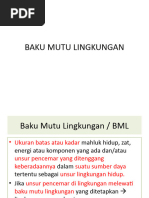 Definisi Baku Mutu Lingkungan (BML) Semua kegiatan ataupun aktifitas manusia baik itu yang berhubungan dengan dunia industri, pekembangan penduduk, kemajuan teknologi maupun kegiatan ekonomi hampir bisa dipastikan akan menghasilkan limbah. Keadaan ini lambat laun akan menyebabkan penumpukan limbah yang berakibat munculnya dampak negative bagi kehidupan. Oleh karenanya dibutuhkan standar tertentu untuk mengeliminir jumlah buangan limbah terhadap lingkungan, yang kemudian dikenal dengan istilah Baku Mutu Lingkungan (BML). Adapun pengertian baku mutu lingkungan adalah batas /kadar maksimum suatu zat atau komponen dari kegiatan manusia atau proses alam yang diperbolehkan berada pada suatu lingkungan agar tidak menimbulkan dampak negative. Dasar hukum baku mutu lingkungan terdapat dalam UU No.4 Thn 1982 pasal 15 yang berbunyi sebagai berikut: Perlindungan lingkungan hidup dilakukan berdasarkan baku mutu lingkungan yang diatur dengan peraturan perundang-undangan. Fungsi Baku Mutu Lingkungan Adapun fungsi dari Baku Mutu Lingkungan diantaranya : indikator/ petunjuk yang menyatakan bahwa suatu lingkungan tercemar Hubungan BML terhadap nilai ambang batas yakni batas daya dukung , daya toleransi atau kemampuan lingkungan. Lingkungan yang tercemar jika kondisi suatu lingkungan telah melewati nilai ambang batas yang telah ditentukan Sebagai penilai bahwa lingkungan telah mengalami pencemaran. Sistem Baku Mutu Lingkungan