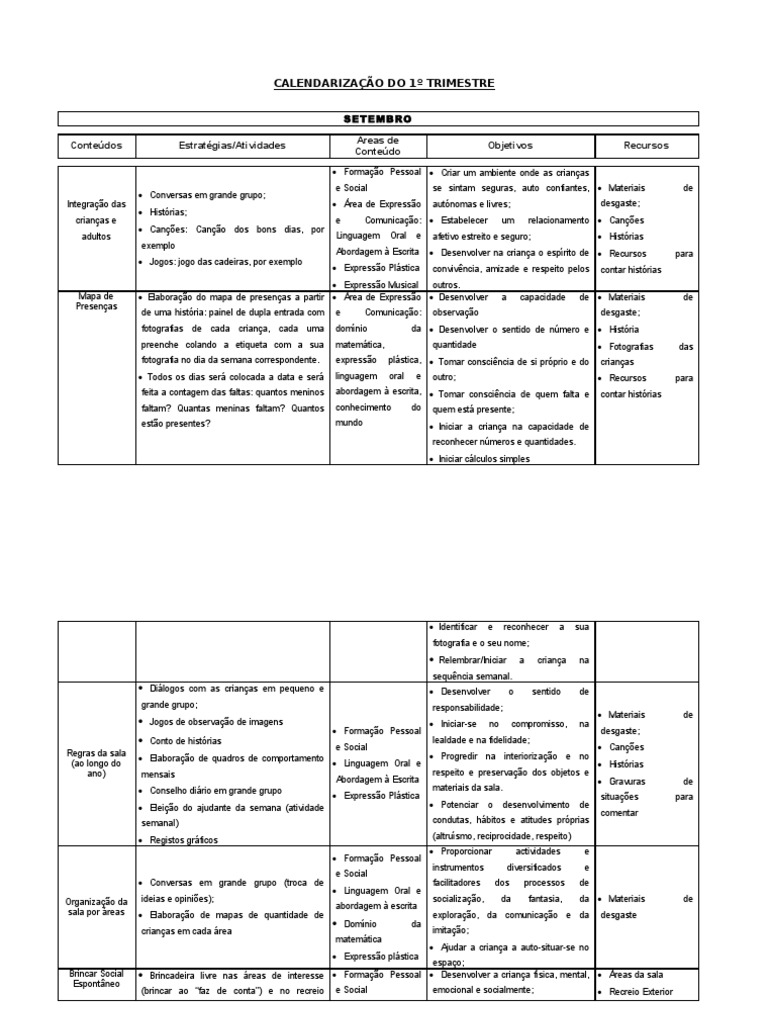 Formao Pessoal Criar um ambiente onde as crianas Integrao das crianas e adultos Conversas em grande grupo; Histrias; Canes: Cano dos bons dias, por exemplo Jogos: jogo das cadeiras, por exemplo e Social rea de Expresso e Linguagem Oral e se sintam seguras, auto confiantes, Materiais autnomas e livres; um afetivo estreito e seguro; convivncia, amizade e respeito pelos a capacidade desgaste; relacionamento Canes Histrias para contar histrias de de