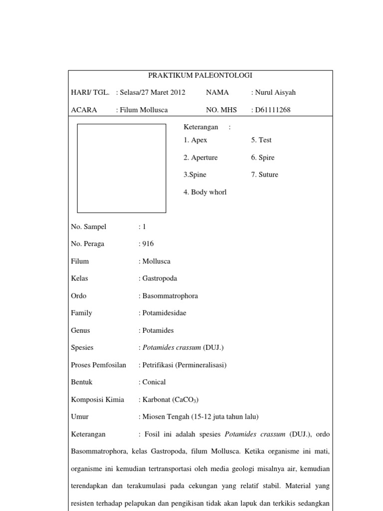 PRAKTIKUM PALEONTOLOGI HARI/ TGL. : Selasa/27 Maret 2012 ACARA : Filum Mollusca NAMA NO. MHS Keterangan 1. Apex 2. Aperture 3. Growth line 4. Test : 5. Spine 6. Spire 7. Body whorl 8. Suture : Nurul Aisyah : D61111268