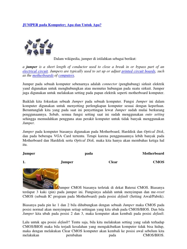 Dalam wikipedia, jumper di istilahkan sebagai berikut: a jumper is a short length of conductor used to close a break in or bypass part of an electrical circuit. Jumpers are typically used to set up or adjust printed circuit boards, such as the motherboards of computers. Jumper pada sebuah komputer sebenarnya adalah connector (penghubung) sirkuit elektrik yand digunakan untuk menghubungkan atau memutus hubungan pada suatu sirkuit. Jumper juga digunakan untuk melakukan setting pada papan elektrik seperti motherboard komputer. Baiklah kita fokuskan sebuah Jumper pada sebuah komputer. Fungsi Jumper ini dalam komputer digunakan untuk menyetting perlengkapan komputer sesuai dengan keperluan. Beruntunglah kita yang pada saat ini penyettingan lewat Jumper sudah mulai berkurang penggunaannya. Sebab, semua fungsi setting saat ini sudah menggunakan outo setting sehingga memudahkan pengguna atau perakit komputer untuk tidak banyak menggunakan Jumper. Jumper pada komputer biasanya digunakan pada Motherboard, Harddisk dan Optical Disk, dan pada beberapa VGA Card tertentu. Tetapi karena penggunaannya lebih banyak pada Motherboard dan Harddisk serta Optical Disk, maka kita hanya akan membahas ketiga hal itu. Jumper 1. Jumper pada Clear Motherboard CMOS