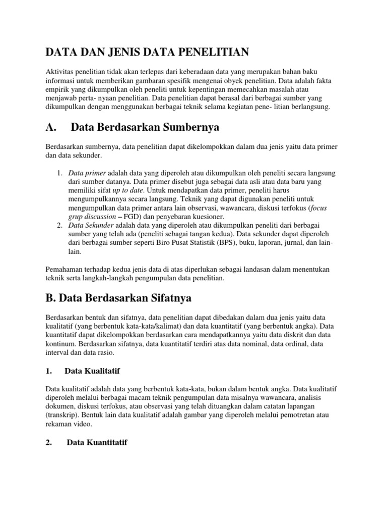 Berdasarkan bentuk dan sifatnya, data penelitian dapat dibedakan dalam dua jenis yaitu data kualitatif (yang berbentuk kata-kata/kalimat) dan data kuantitatif (yang berbentuk angka). Data kuantitatif dapat dikelompokkan berdasarkan cara mendapatkannya yaitu data diskrit dan data kontinum. Berdasarkan sifatnya, data kuantitatif terdiri atas data nominal, data ordinal, data interval dan data rasio.