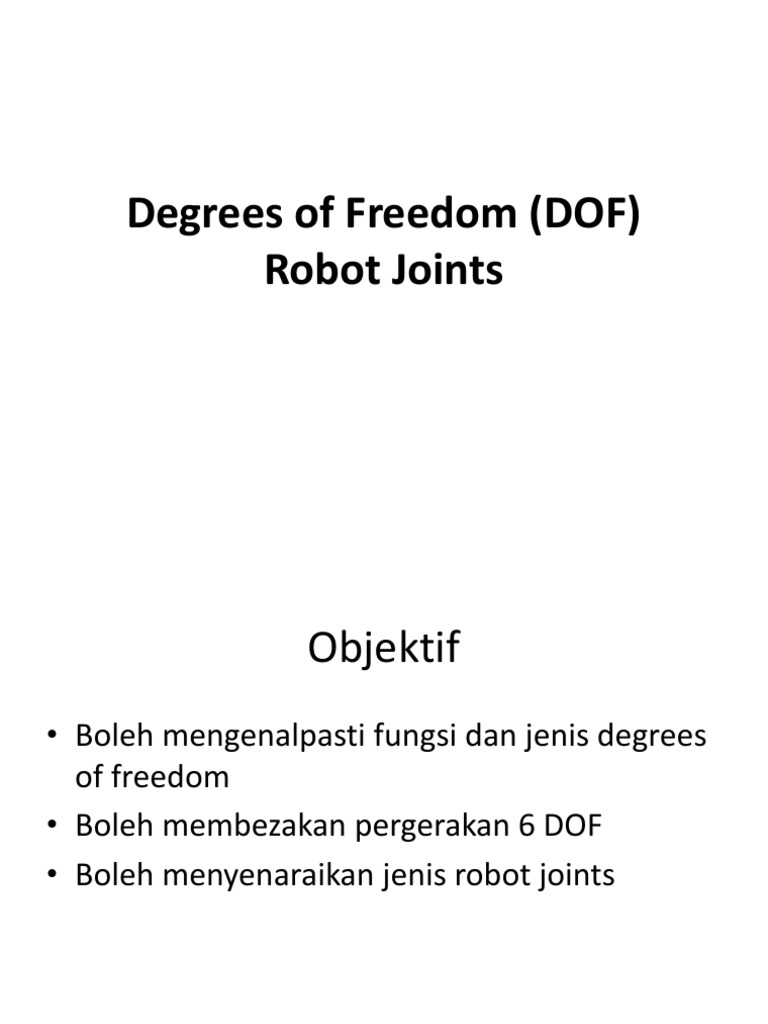 Boleh mengenalpasti fungsi dan jenis degrees of freedom Boleh membezakan pergerakan 6 DOF Boleh menyenaraikan jenis robot joints