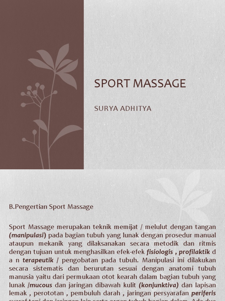 Sport Massage merupakan teknik memijat / melulut dengan tangan (manipulasi) pada bagian tubuh yang lunak dengan prosedur manual ataupun mekanik yang dilaksanakan secara metodik dan ritmis dengan tujuan untuk menghasilkan efek-efek fisiologis , profilaktik d a n terapeutik / pengobatan pada tubuh. Manipulasi ini dilakukan secara sistematis dan berurutan sesuai dengan anatomi tubuh manusia yaitu dari permukaan otot kearah dalam bagian tubuh yang lunak /mucous dan jaringan dibawah kulit (konjunktiva) dan lapisan lemak , perototan , pembuluh darah , jaringan persyarafan periferis syaraf tepi dan jaringan lain serta organ tubuh bagian dalam. Ada dua macam prosedur sport massage , secara manual dan mekanik.