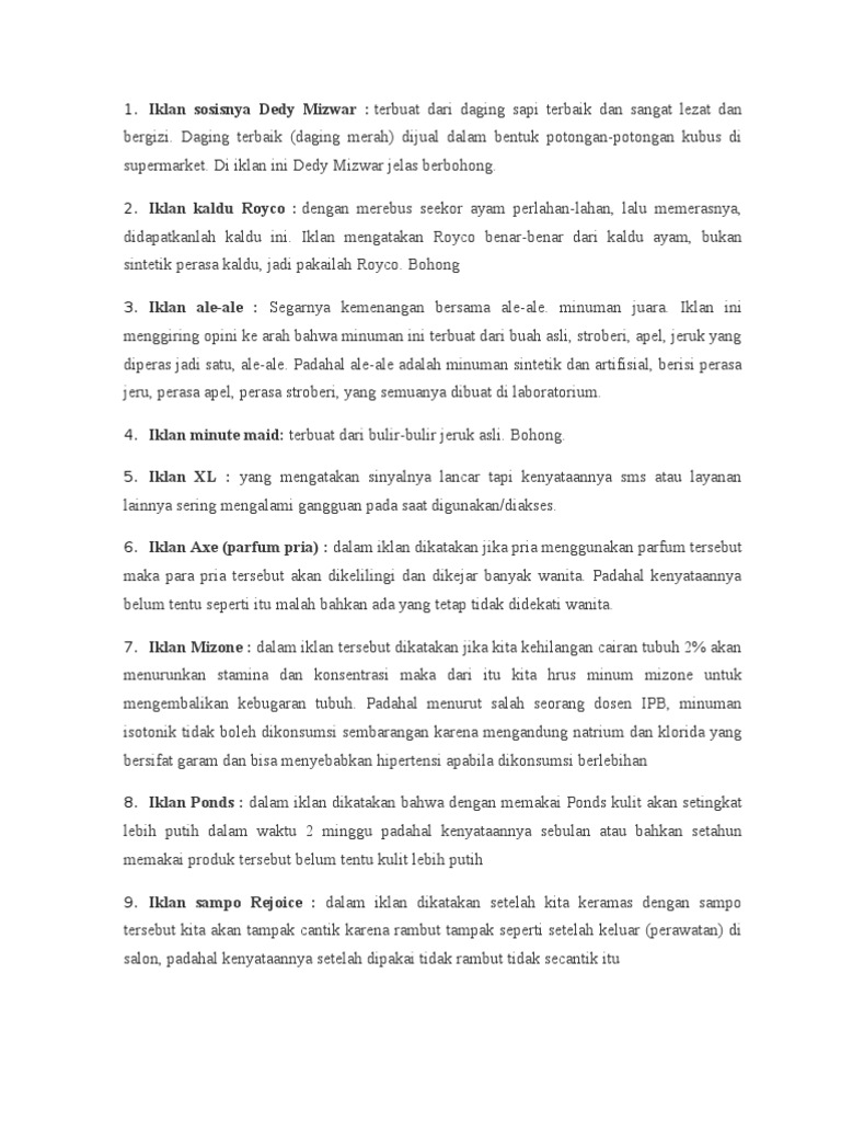 4. Iklan minute maid: terbuat dari bulir-bulir jeruk asli. Bohong. 5. Iklan XL : yang mengatakan sinyalnya lancar tapi kenyataannya sms atau layanan