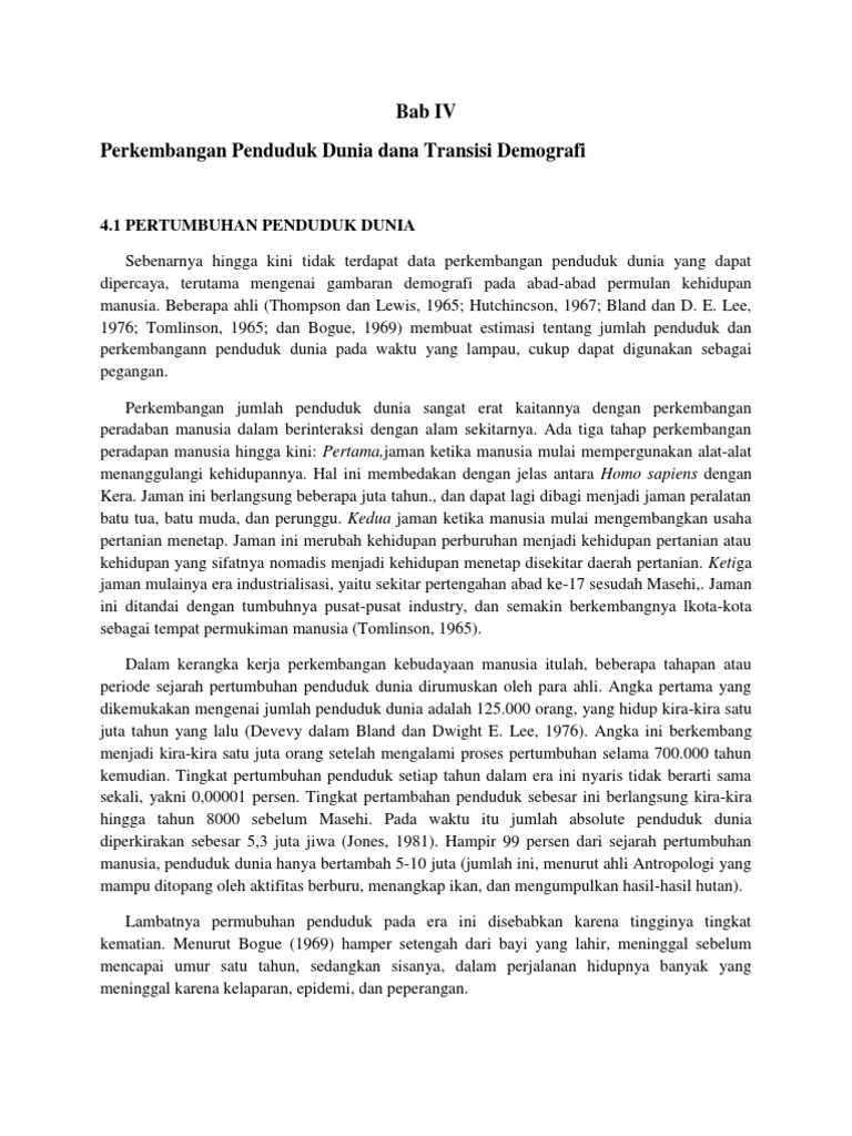 4.1 PERTUMBUHAN PENDUDUK DUNIA Sebenarnya hingga kini tidak terdapat data perkembangan penduduk dunia yang dapat dipercaya, terutama mengenai gambaran demografi pada abad-abad permulan kehidupan manusia. Beberapa ahli (Thompson dan Lewis, 1965; Hutchincson, 1967; Bland dan D. E. Lee, 1976; Tomlinson, 1965; dan Bogue, 1969) membuat estimasi tentang jumlah penduduk dan perkembangann penduduk dunia pada waktu yang lampau, cukup dapat digunakan sebagai pegangan. Perkembangan jumlah penduduk dunia sangat erat kaitannya dengan perkembangan peradaban manusia dalam berinteraksi dengan alam sekitarnya. Ada tiga tahap perkembangan peradapan manusia hingga kini: Pertama,jaman ketika manusia mulai mempergunakan alat-alat menanggulangi kehidupannya. Hal ini membedakan dengan jelas antara Homo sapiens dengan Kera. Jaman ini berlangsung beberapa juta tahun., dan dapat lagi dibagi menjadi jaman peralatan batu tua, batu muda, dan perunggu. Kedua jaman ketika manusia mulai mengembangkan usaha pertanian menetap. Jaman ini merubah kehidupan perburuhan menjadi kehidupan pertanian atau kehidupan yang sifatnya nomadis menjadi kehidupan menetap disekitar daerah pertanian. Ketiga jaman mulainya era industrialisasi, yaitu sekitar pertengahan abad ke-17 sesudah Masehi,. Jaman ini ditandai dengan tumbuhnya pusat-pusat industry, dan semakin berkembangnya lkota-kota sebagai tempat permukiman manusia (Tomlinson, 1965). Dalam kerangka kerja perkembangan kebudayaan manusia itulah, beberapa tahapan atau periode sejarah pertumbuhan penduduk dunia dirumuskan oleh para ahli. Angka pertama yang dikemukakan mengenai jumlah penduduk dunia adalah 125.000 orang, yang hidup kira-kira satu juta tahun yang lalu (Devevy dalam Bland dan Dwight E. Lee, 1976). Angka ini berkembang menjadi kira-kira satu juta orang setelah mengalami proses pertumbuhan selama 700.000 tahun kemudian. Tingkat pertumbuhan penduduk setiap tahun dalam era ini nyaris tidak berarti sama sekali, yakni 0,00001 persen. Tingkat pertambahan penduduk sebesar ini berlangsung kira-kira hingga tahun 8000 sebelum Masehi. Pada waktu itu jumlah absolute penduduk dunia diperkirakan sebesar 5,3 juta jiwa (Jones, 1981). Hampir 99 persen dari sejarah pertumbuhan manusia, penduduk dunia hanya bertambah 5-10 juta (jumlah ini, menurut ahli Antropologi yang mampu ditopang oleh aktifitas berburu, menangkap ikan, dan mengumpulkan hasil-hasil hutan). Lambatnya permubuhan penduduk pada era ini disebabkan karena tingginya tingkat kematian. Menurut Bogue (1969) hamper setengah dari bayi yang lahir, meninggal sebelum mencapai umur satu tahun, sedangkan sisanya, dalam perjalanan hidupnya banyak yang meninggal karena kelaparan, epidemi, dan peperangan.
