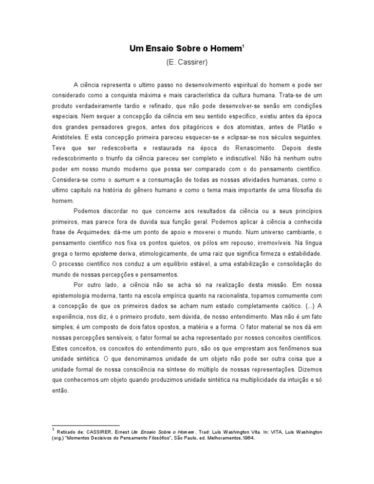 Retirado de: CASSIRER, Ernest Um Ensaio Sobre o Homem. Trad: Lus Washington Vita. In: VITA, Luis Washington (org.) Momentos Decisivos do Pensamento Filosfico, So Paulo, ed. Melhoramentos,1964.