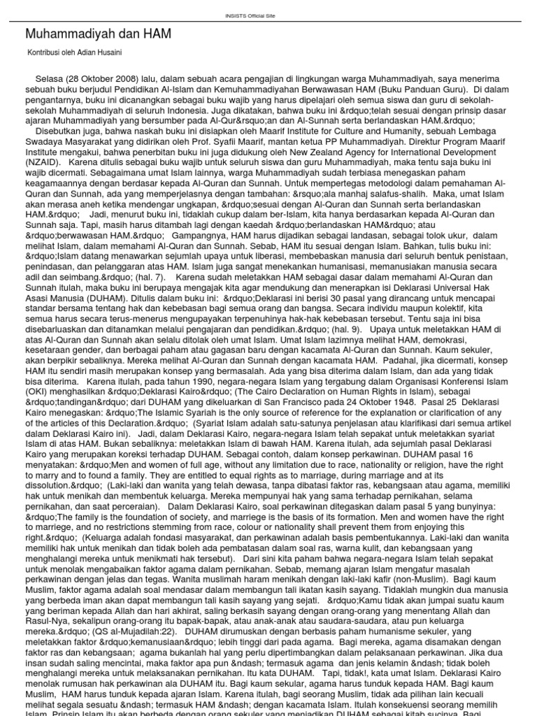 melihat Islam, dalam memahami Al-Quran dan Sunnah. Sebab, HAM itu sesuai dengan Islam. Bahkan, tulis buku ini: