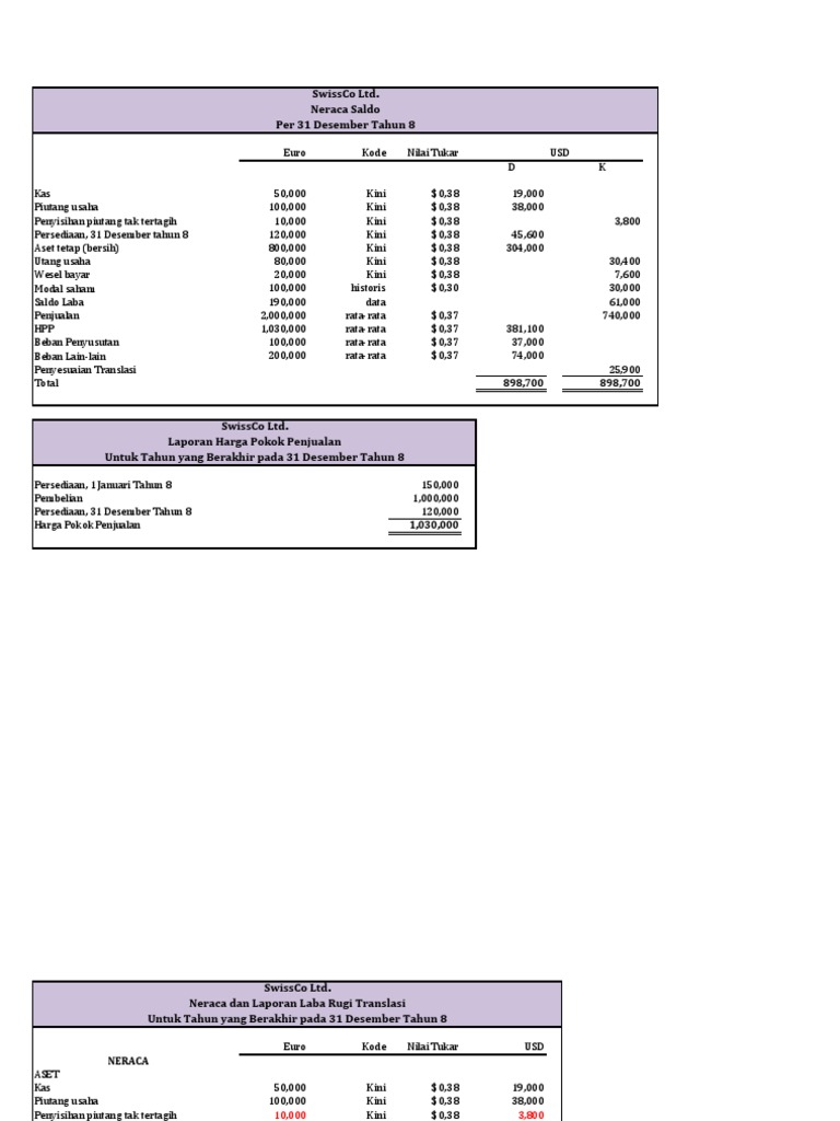 Pembahasan : a. Menyusun Neraca Saldo SwissCo dalam AS$ per 31 Desember Tahun 8 . Berpedoman pada tabel nilai tukar yang digunakan untuk translasi di halaman 373, hasil translasi untuk setiap akun adalah sebagai Akun Kas Piutang usaha Penyisihan piutang tak tertagih Persediaan, 31 Desember tahun 8 Aset tetap (bersih) Utang usaha Wesel bayar Modal saham Saldo Laba Penjualan HPP Beban penyusutan Dihitung 50,000 100,000 10,000 120,000 800,000 80,000 20,000 100,000 Kurs yang digunakan Kini Kini Kini Kini Kini Kini Kini Historis Hasil 2,000,000 Rata-rata 100,000 $ 0,38 $ 0,38 $ 0,38 $ 0,38 $ 0,38 $ 0,38 $ 0,38 $ 0,30 $ 0,36 $ 0,36