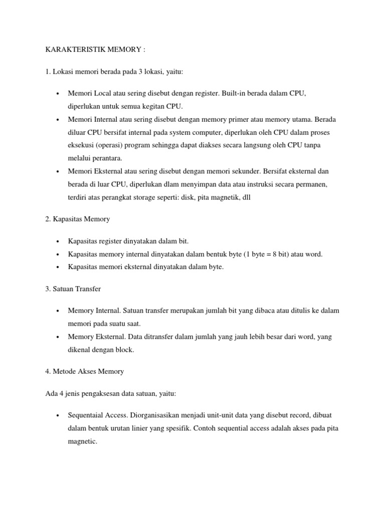 Register. Jenis memori yang tercepat, terkecil, dan termahal yang merupakan memori internal bagi prosesor. Memori Utama. Merupakan sistem internal memory dari sebuah komputer. Setiap lokasi di dalam memori utama memiliki alamat yang unik.