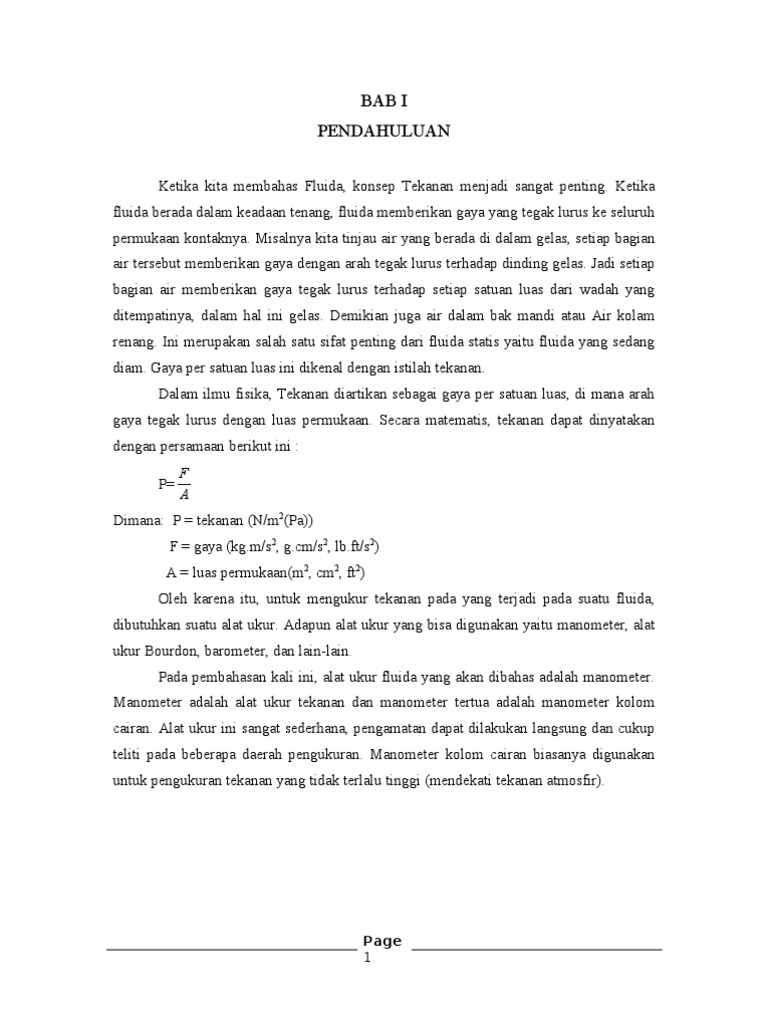 Dimana: P = tekanan (N/m2(Pa)) F = gaya (kg.m/s2, [Link]/s2, [Link]/s2) A = luas permukaan(m2, cm2, ft2) Oleh karena itu, untuk mengukur tekanan pada yang terjadi pada suatu fluida, dibutuhkan suatu alat ukur. Adapun alat ukur yang bisa digunakan yaitu manometer, alat ukur Bourdon, barometer, dan lain-lain. Pada pembahasan kali ini, alat ukur fluida yang akan dibahas adalah manometer. Manometer adalah alat ukur tekanan dan manometer tertua adalah manometer kolom cairan. Alat ukur ini sangat sederhana, pengamatan dapat dilakukan langsung dan cukup teliti pada beberapa daerah pengukuran. Manometer kolom cairan biasanya digunakan untuk pengukuran tekanan yang tidak terlalu tinggi (mendekati tekanan atmosfir).