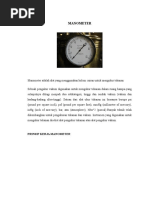 Definisi Manometer Manometer adalah suatu alat pengukur tekanan yang menggunakan kolom cairan untuk mengukur perbedaan tekanan antara suatu titik tertentu dengan tekanan atmosfer (tekanan terukur), atau perbedaan tekanan antara dua titik. Manometer adalah alat yang digunakan secara luas pada audit energi untuk mengukur perbedaan tekanan di dua titik yang berlawanan. Jenis manometer tertua adalah manometer kolom cairan. Versi manometer sederhana kolom cairan adalah bentuk pipa U yang diisi cairan setengahnya (biasanya berisi minyak, air atau air raksa) dimana pengukuran dilakukan pada satu sisi pipa, sementara tekanan (yang mungkin terjadi karena atmosfir) diterapkan pada tabung yang lainnya. Perbedaan ketinggian cairan memperlihatkan tekanan yang diterapkan.