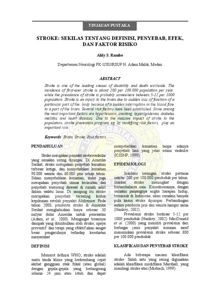 Aldy S. Rambe Departemen Neurologi FK-USU/RSUP H. Adam Malik, Medan ABSTRACT Stroke is one of the leading causes of disability and death worlwide. The incidence of first-ever stroke is about 200 per 100.000 population per year, while the prevalence of stroke is probably somewhere between 5-12 per 1000 population. Stroke is an injury to the brain due to sudden loss of function of a particular part of the body because of a sudden interruption in the blood flow to a part of the brain. Several risk factors have been established. Some among the most important factors are hypertension, smoking, hyperlipidemia, diabetes mellitus and heart diseases. Due to the massive impact of stroke to the population, stroke prevention program, eg. by modifying risk factors, play an important role. Keywords: Brain, Stroke, Risk factors PENDAHULUAN Stroke merupakan penyakit serebrovaskular yang semakin sering dijumpai. Di Amerika Serikat, stroke merupakan penyebab kematian terbesar ketiga, dan menyebabkan kematian 90.000 wanita dan 60.000 pria setiap tahun. Selain menyebabkan kematian, stoke juga merupakan penyebab utama kecacatan dan penyebab seseorang dirawat di rumah sakit dalam waktu lama. Di samping itu stroke merupakan penyebab tersering kedua kepikunan setelah penyakit Alzheimer. Pada tahun 2000, penderita stroke di Amerika Serikat menghabiskan biaya sebesar 30 milyar dolar Amerika untuk perawatan (Adam, et al., 2000). Mengingat besarnya dampak yang ditimbulkan oleh stroke, upaya preventif dan terapi yang efektif akan sangat besar pengaruhnya terhadap kesehatan masyarakat. DEFINISI Menurut definisi WHO, stroke adalah suatu tanda klinis yang berkembang cepat akibat gangguan otak fokal (atau global) dengan gejala-gejala yang berlangsung selama 24 jam atau lebih dan dapat menyebabkan kematian tanpa adanya penyebab lain yang jelas selain vaskuler (KSSNP, 1999). EPIDEMIOLOGI Insidens serangan stroke pertama sekitar 200 per 100.000 penduduk per tahun. Insiden stroke meningkat dengan bertambahnya usia. Konsekuensinya, dengan semakin panjangnya angka harapan hidup, termasuk di Indonesia, akan semakin banyak pula kasus stroke dijumpai. Perbandingan antara penderita pria dan wanita hampir sama (Hankey, 2002). Prevalensi stroke berkisar 5-12 per 1000 penduduk (Hankey, 2002). MacDonald et al. (2000) yang meneliti prevalensi dari berbagai jenis penyakit susunan saraf menemukan prevalensi stroke sebesar 800 per 100.000 penduduk. KLASIFIKASI DAN PENYEBAB STROKE Ada beberapa macam klasifikasi stroke. Salah satu yang sering digunakan adalah klasifikasi modifikasi Marshall, yang membagi stroke atas (Misbach, 1999):