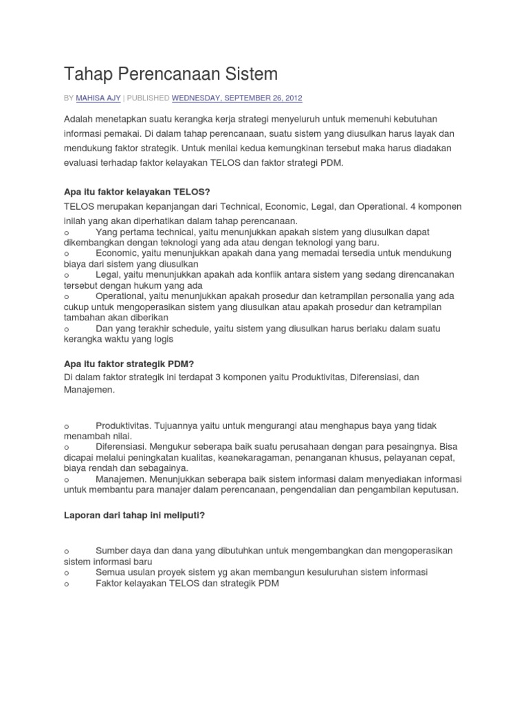 Adalah menetapkan suatu kerangka kerja strategi menyeluruh untuk memenuhi kebutuhan informasi pemakai. Di dalam tahap perencanaan, suatu sistem yang diusulkan harus layak dan mendukung faktor strategik. Untuk menilai kedua kemungkinan tersebut maka harus diadakan evaluasi terhadap faktor kelayakan TELOS dan faktor strategi PDM. Apa itu faktor kelayakan TELOS? TELOS merupakan kepanjangan dari Technical, Economic, Legal, dan Operational. 4 komponen inilah yang akan diperhatikan dalam tahap perencanaan. o Yang pertama technical, yaitu menunjukkan apakah sistem yang diusulkan dapat dikembangkan dengan teknologi yang ada atau dengan teknologi yang baru. o Economic, yaitu menunjukkan apakah dana yang memadai tersedia untuk mendukung biaya dari sistem yang diusulkan o Legal, yaitu menunjukkan apakah ada konflik antara sistem yang sedang direncanakan tersebut dengan hukum yang ada o Operational, yaitu menunjukkan apakah prosedur dan ketrampilan personalia yang ada cukup untuk mengoperasikan sistem yang diusulkan atau apakah prosedur dan ketrampilan tambahan akan diberikan o Dan yang terakhir schedule, yaitu sistem yang diusulkan harus berlaku dalam suatu kerangka waktu yang logis Apa itu faktor strategik PDM? Di dalam faktor strategik ini terdapat 3 komponen yaitu Produktivitas, Diferensiasi, dan Manajemen.