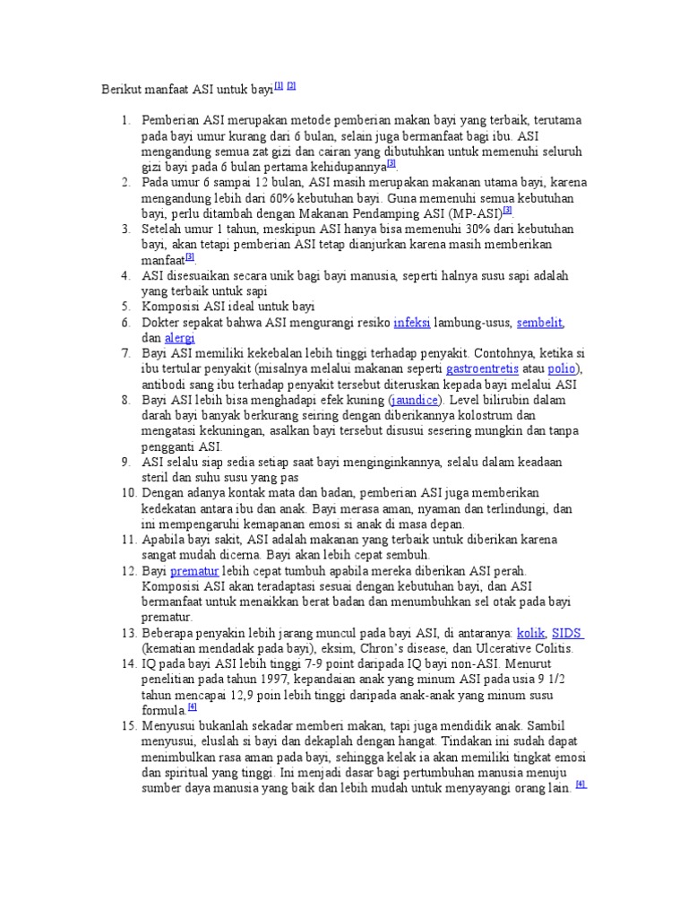 Pemberian ASI merupakan metode pemberian makan bayi yang terbaik, terutama pada bayi umur kurang dari 6 bulan, selain juga bermanfaat bagi ibu. ASI mengandung semua zat gizi dan cairan yang dibutuhkan untuk memenuhi seluruh gizi bayi pada 6 bulan pertama kehidupannya[3]. 2. Pada umur 6 sampai 12 bulan, ASI masih merupakan makanan utama bayi, karena mengandung lebih dari 60% kebutuhan bayi. Guna memenuhi semua kebutuhan bayi, perlu ditambah dengan Makanan Pendamping ASI (MP-ASI)[3]. 3. Setelah umur 1 tahun, meskipun ASI hanya bisa memenuhi 30% dari kebutuhan bayi, akan tetapi pemberian ASI tetap dianjurkan karena masih memberikan manfaat[3]. 4. ASI disesuaikan secara unik bagi bayi manusia, seperti halnya susu sapi adalah yang terbaik untuk sapi 5. Komposisi ASI ideal untuk bayi 6. Dokter sepakat bahwa ASI mengurangi resiko infeksi lambung-usus, sembelit, dan alergi 7. Bayi ASI memiliki kekebalan lebih tinggi terhadap penyakit. Contohnya, ketika si ibu tertular penyakit (misalnya melalui makanan seperti gastroentretis atau polio), antibodi sang ibu terhadap penyakit tersebut diteruskan kepada bayi melalui ASI 8. Bayi ASI lebih bisa menghadapi efek kuning (jaundice). Level bilirubin dalam darah bayi banyak berkurang seiring dengan diberikannya kolostrum dan mengatasi kekuningan, asalkan bayi tersebut disusui sesering mungkin dan tanpa pengganti ASI. 9. ASI selalu siap sedia setiap saat bayi menginginkannya, selalu dalam keadaan steril dan suhu susu yang pas 10. Dengan adanya kontak mata dan badan, pemberian ASI juga memberikan kedekatan antara ibu dan anak. Bayi merasa aman, nyaman dan terlindungi, dan ini mempengaruhi kemapanan emosi si anak di masa depan. 11. Apabila bayi sakit, ASI adalah makanan yang terbaik untuk diberikan karena sangat mudah dicerna. Bayi akan lebih cepat sembuh. 12. Bayi prematur lebih cepat tumbuh apabila mereka diberikan ASI perah. Komposisi ASI akan teradaptasi sesuai dengan kebutuhan bayi, dan ASI bermanfaat untuk menaikkan berat badan dan menumbuhkan sel otak pada bayi prematur. 13. Beberapa penyakin lebih jarang muncul pada bayi ASI, di antaranya: kolik, SIDS (kematian mendadak pada bayi), eksim, Chrons disease, dan Ulcerative Colitis. 14. IQ pada bayi ASI lebih tinggi 7-9 point daripada IQ bayi non-ASI. Menurut penelitian pada tahun 1997, kepandaian anak yang minum ASI pada usia 9 1/2 tahun mencapai 12,9 poin lebih tinggi daripada anak-anak yang minum susu formula.[4] 15. Menyusui bukanlah sekadar memberi makan, tapi juga mendidik anak. Sambil menyusui, eluslah si bayi dan dekaplah dengan hangat. Tindakan ini sudah dapat menimbulkan rasa aman pada bayi, sehingga kelak ia akan memiliki tingkat emosi dan spiritual yang tinggi. Ini menjadi dasar bagi pertumbuhan manusia menuju sumber daya manusia yang baik dan lebih mudah untuk menyayangi orang lain. [4]