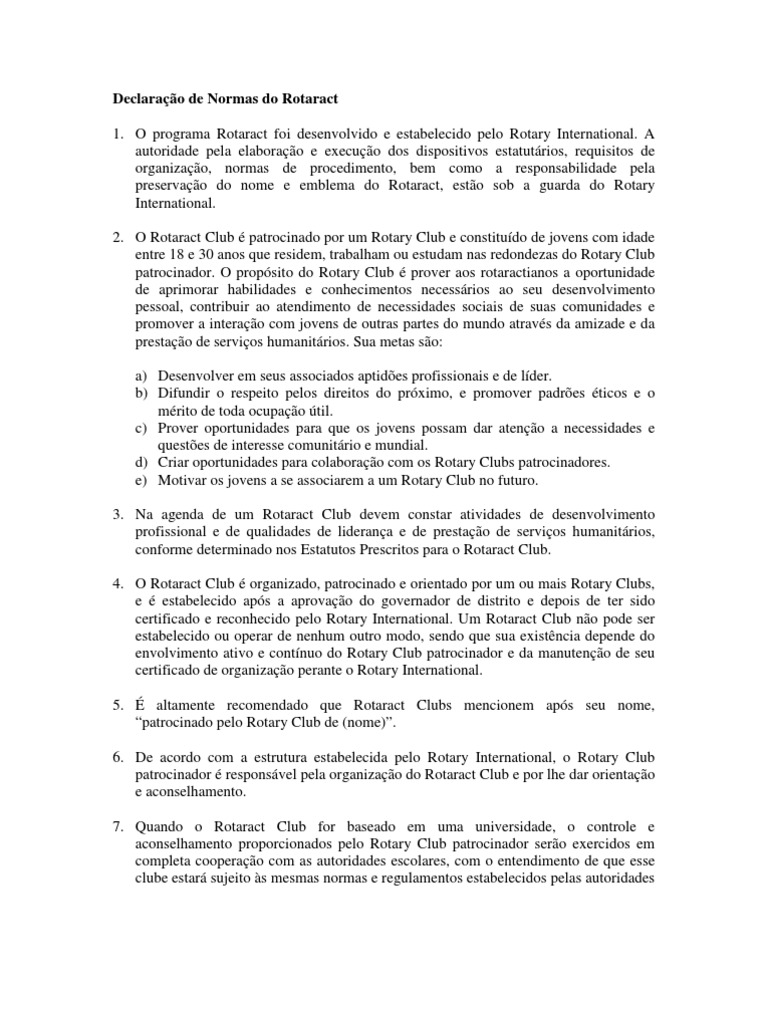 para todas as agremiaes estudantis e atividades extracurriculares da instituio de ensino. 8. Todas as atividades, projetos e programas do Rotaract Club devem ser conduzidos de acordo com as normas do Rotary International. A manuteno do patrocnio por um Rotary Club e do certificado de organizao perante o RI so condicionados ao cumprimento destes requisitos. 9. O Rotary International estabeleceu Estatutos Prescritos para o Rotaract Club que somente podem ser alterados pelo Conselho Diretor do Rotary International. requisito para a organizao e certificao de um Rotaract Club que este se comprometa a adotar os Estatutos Prescritos para o Rotaract Club e todas as emendas subsequentes. 10. Todo Rotaract Club deve adotar um Regimento Interno que esteja de acordo com os Estatutos Prescritos para o Rotaract Club e com as normas estabelecidas pelo Rotary International. Esse Regimento Interno est sujeito aprovao do Rotary Club patrocinador. 11. Rotaract Clubs podem ser patrocinados somente por Rotary Clubs pertencentes ao distrito em que eles esto localizados. 12. Um Rotaract Club poder ser organizado e patrocinado por mais de um Rotary Club, desde que: a) O governador de distrito ateste, por escrito, que na sua opinio os melhores interesses do distrito, dos Rotary Clubs envolvidos e do programa Rotaract seriam melhor servidos pelo patrocnio conjunto. b) A organizao de dois ou mais Rotaract Clubs patrocinados por Rotary Clubs diferentes resultaria em uma diviso forada do que essencialmente um nico grupo de estudantes dentro da universidade ou comunidade. c) Uma Comisso Rotaract conjunta seja estabelecida, com representao de cada um dos Rotary Clubs patrocinadores. 13. Cada associado do Rotaract Club concorde em obedecer aos dispositivos dos Estatutos e Regimento Interno do seu Rotaract Club. 14. Rotaractianos podem repor frequncia participando de reunies de Rotary Clubs, conforme decidido pelo Rotary Club patrocinador. Rotary Clubs que patrocinem Rotaract Clubs devem convidar rotaractianos para participar de suas reunies semanais para repor reunies que tenham perdido no Rotaract Club. 15. No dia 30 de junho do ano rotrio no qual o associado completa 30 anos, seu ttulo de associado cancelado.
