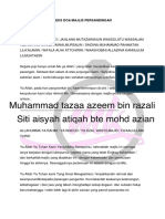 * kepada yang beragama islam diminta untuk menadah tangan semasa bacaan doa dan yang bukan beragama islam di persilakan untuk turut sama bertafakur mengikut ajaran agama masing-masing. Bacaan Al-Fatihah. Doa pembukaan Alahamdulillah hi rabbil alamin..hamdan haamidin...... Ya Allah Ya Rahman Ya Rahim, Ampunkanlah Dosa-Dosa Kami, Berikanlah Taufik Dan Hidayah Kepada Jiwa2 Kami Dan Orang-Orang Yang Kami Sayangi. Ya Allah Tuhan Yang Sangat Banyak Memberi, Janganlah Kamu Memalingkan Hati Kami Setelah Engkau Memberi Petunjuk Kepada Kami Dan Berikanlah Kami Rahmatmu Yang Besar. Ya Allah Ya Karim, Sesungguhnya Hati-Hati Ini Berkumpul Kerana Mengasihi Mu Dan Ingin Mencari Keredhaanmu. Wahai Tuhanku, Perbaikanlah hubungan diantara kami, dan jinakanlah hati-hati diantara kami, dan tunjukkanlah jalan yang baik kepada kami dan berilah kami kejayaan dari sesuatu yang sukar kepada yang senang.Jauhkanlan kami dari keburukan samada yang zahir atau tersembunyi. Ya Allah, Berkatilah Majlis Perkahwinan Ini, Limpahkanlah Baraqah Dan RahmatMu Kepada Kedua Mempelai Ini, RAMLI BIN SUBUH DAN PASANGANYA NORLIZA BT ASRI. Kurniakanlah Mereka Zuriat Yang Soleh Dan Solehah. Kekalkanlah Jodoh Mereka Di Dunia Dan Di Akhirat, Dan Sempurnakanlah Agama Mereka Dengan Berkat Ikatan Ini. Ya Allah Ya Tuhan Kami, Kurniakan Rahmat Kepada Pengantin, Suami Isteri Agar Kekal Abadi, Aman Damai Yang Berkekalan Di Alam Rumahtangga, Sihat Walafiat, Dimurahkan Rezeki Dan Dilanjutkan Usia Serta Mendapat Syafaat Daripada Junjungan Besar Nabi Muhammad SAW. Ya Allah, Satukanlah Hati Kedua Mempelai Ini, Seperti Engkau Satukan Hati Adam Dan Hawa, Yusuf Dan Zulaikha, Sulaiman dan Balqis Dan apatah lagi Seperti Engkau Satukan Hati Muhammad Saw Dan Siti Khadijah. Semoga Allah Memberi Barakah Kepada pasangan pengantin ini RAMLI BIN SUBUH DAN PASANGANYA NORLIZA BT ASRI Dengan Kebaikan dan keberkatan. Ya Allah... Ya zaljalaali wal Ikram, Pada hari ini juga kami merafa'kan kesyukuran kepadaMu Ya Allah, di samping majlis yang serba indah ini, kami merasa amat beruntung dan bertuah kerana Kami dikunjungi oleh tetamu yang amat di alukan akan kedatangan mereka,Moga-moga kehadiran mereka akan menambah seri dan menyemarakkan lagi keberkatan majlis ini.Berkatilah tuan majlis ini Encik Asri b Shamsi dan keluarga serta Encik subuh b Haji Dorahman dan isterinya Puan Jurum bt Sahak. , kurniakanlah kepada mereka seisi keluarga kemurahan rezeki yang halal serta di berkati olehMu Ya Allah. Allahummaj al Jam'anaa, jam'an marhuuma....watafarruqnaa mim ba'dihi tafarruqqan ma'suuma.Jadikanlah pertemuan kami pada majlis ini, pertemuan yang diberkati dan perpisahan kami selepas majlis ini perpisahan yang baik dan tanpa dosa. Rabbanaa aatina..........Amin yan Rabbal a'lamin.