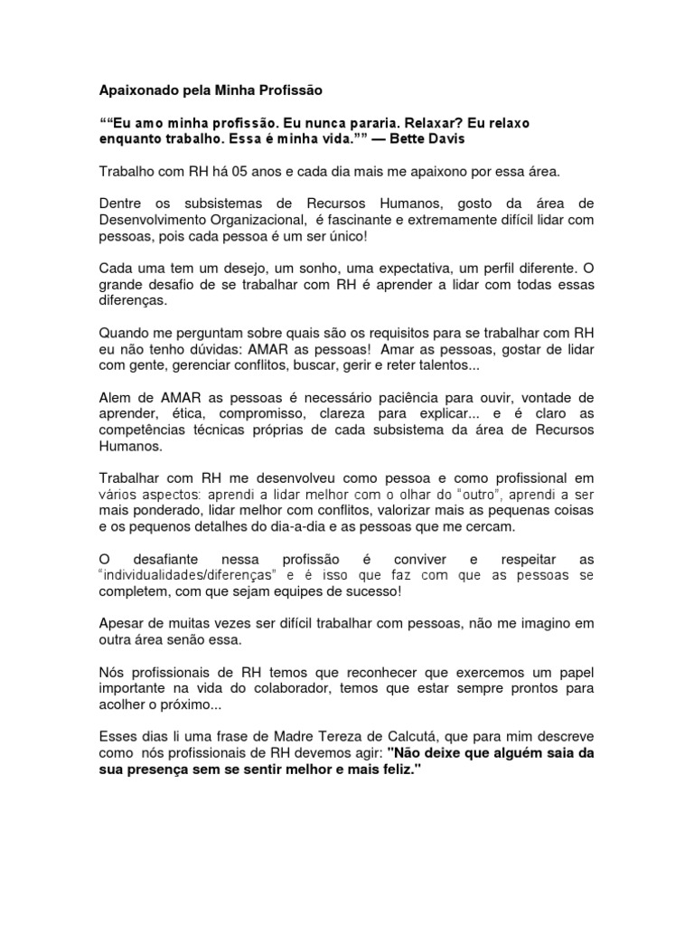 Essa minha vida. Bette Davis Trabalho com RH h 05 anos e cada dia mais me apaixono por essa rea. Dentre os subsistemas de Recursos Humanos, gosto da rea de Desenvolvimento Organizacional, fascinante e extremamente difcil lidar com pessoas, pois cada pessoa um ser nico! Cada uma tem um desejo, um sonho, uma expectativa, um perfil diferente. O grande desafio de se trabalhar com RH aprender a lidar com todas essas diferenas. Quando me perguntam sobre quais so os requisitos para se trabalhar com RH eu no tenho dvidas: AMAR as pessoas! Amar as pessoas, gostar de lidar com gente, gerenciar conflitos, buscar, gerir e reter talentos... Alem de AMAR as pessoas necessrio pacincia para ouvir, vontade de aprender, tica, compromisso, clareza para explicar... e claro as competncias tcnicas prprias de cada subsistema da rea de Recursos Humanos. Trabalhar com RH me desenvolveu como pessoa e como profissional em vrios aspectos: aprendi a lidar melhor com o olhar do outro, aprendi a ser mais ponderado, lidar melhor com conflitos, valorizar mais as pequenas coisas e os pequenos detalhes do dia-a-dia e as pessoas que me cercam. O desafiante nessa profisso conviver e respeitar as individualidades/diferenas e isso que faz com que as pessoas se completem, com que sejam equipes de sucesso! Apesar de muitas vezes ser difcil trabalhar com pessoas, no me imagino em outra rea seno essa. Ns profissionais de RH temos que reconhecer que exercemos um papel importante na vida do colaborador, temos que estar sempre prontos para acolher o prximo... Esses dias li uma frase de Madre Tereza de Calcut, que para mim descreve como ns profissionais de RH devemos agir: "No deixe que algum saia da sua presena sem se sentir melhor e mais feliz."