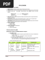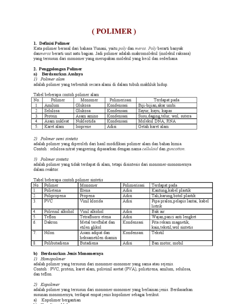 1. Definisi Polimer Kata polimer berasal dari bahasa Yunani, yaitu poly dan meros. Poly berarti banyak danmeros berarti unit aatu bagian. Jadi polimer adalah makromolekul (molekul raksasa) yang tersusun dari monomer yang merupakan molekul yang kecil dan sederhana. 2. Penggolongan Polimer a) Berdasarkan Asalnya 1) Polimer alam adalah polimer yang terbentuk secara alami di dalam tubuh makhluk hidup. Tabel beberapa contoh polimer alam No. Polimer Monomer 1. Amilum Glukosa 2. Selulosa Glukosa 3. Protein Asam amino 4. Asam nukleat Nukleotida 5. Karet alam Isoprene Polimerisasi Kondensasi Kondensasi Kondensasi Kondensasi Adisi Terdapat pada Biji-bijian,akar umbi Sayur, kayu, kapas Susu,daging,telur, wol, sutera Molekul DNA, RNA Getah karet alam
