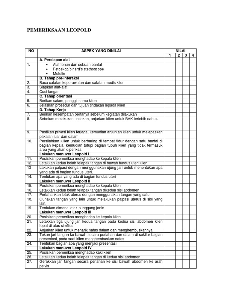 ASPEK YANG DINILAI 1 A. Persiapan alat Alat tenun dan sebuah bantal Fetoskop/pinards stethoscope Metelin B. Tahap pre-interaksi Baca catatan keperawatan dan catatan medis klien Siapkan alat-alat Cuci tangan C. Tahap orientasi Berikan salam, panggil nama klien Jelaskan prosedur dan tujuan tindakan lepada klien D. Tahap Kerja Berikan kesempatan bertanya sebelum kegiatan dilakukan Sebelum melakukan tindakan, anjurkan klien untuk BAK terlebih dahulu