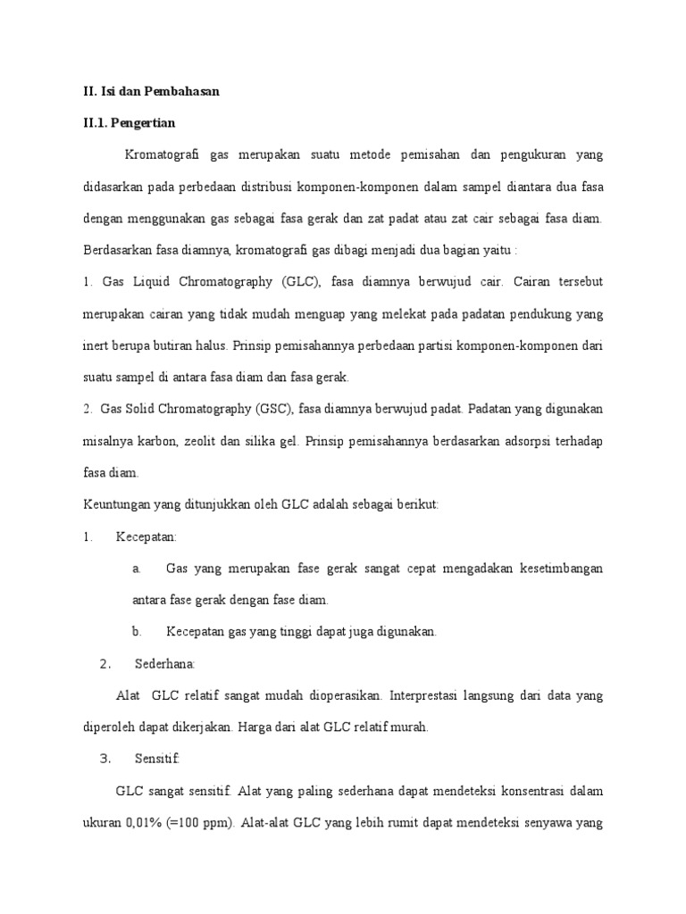 Pengertian Kromatografi gas merupakan suatu metode pemisahan dan pengukuran yang didasarkan pada perbedaan distribusi komponen-komponen dalam sampel diantara dua fasa dengan menggunakan gas sebagai fasa gerak dan zat padat atau zat cair sebagai fasa diam. Berdasarkan fasa diamnya, kromatografi gas dibagi menjadi dua bagian yaitu : 1. Gas Liquid Chromatography (GLC), fasa diamnya berwujud cair. Cairan tersebut merupakan cairan yang tidak mudah menguap yang melekat pada padatan pendukung yang inert berupa butiran halus. Prinsip pemisahannya perbedaan partisi komponen-komponen dari suatu sampel di antara fasa diam dan fasa gerak. 2. Gas Solid Chromatography (GSC), fasa diamnya berwujud padat. Padatan yang digunakan misalnya karbon, zeolit dan silika gel. Prinsip pemisahannya berdasarkan adsorpsi terhadap fasa diam. Keuntungan yang ditunjukkan oleh GLC adalah sebagai berikut: 1. Kecepatan: a. Gas yang merupakan fase gerak sangat cepat mengadakan kesetimbangan