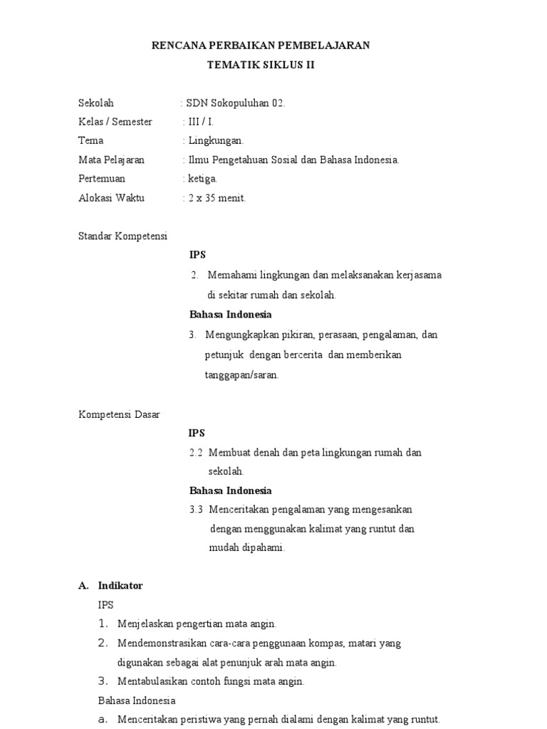 Kompetensi IPS 2. Memahami lingkungan dan melaksanakan kerjasama di sekitar rumah dan sekolah. Bahasa Indonesia 3. Mengungkapkan pikiran, perasaan, pengalaman, dan petunjuk dengan bercerita dan memberikan tanggapan/saran. : SDN Sokopuluhan 02. : III / I. : Lingkungan. : Ilmu Pengetahuan Sosial dan Bahasa Indonesia. : ketiga. : 2 x 35 menit.