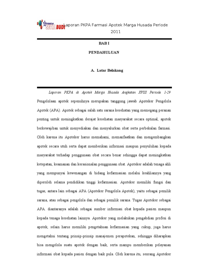 Laporan PKPA Farmasi Apotek Marga Husada Periode 2011 BAB I PENDAHULUAN