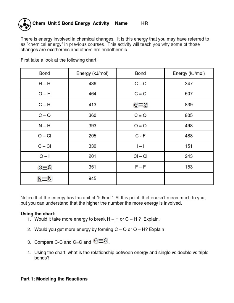 There is energy involved in chemical changes. It is this energy that you may have referred to as chemical energy in previous courses. This activity will teach you why some of those changes are exothermic and others are endothermic. First take a look at the following chart: Bond HH OH CH CO NH O Cl C Cl OI Energy (kJ/mol) 436 464 413 360 393 205 330 201 351 945 C=O O=O C-F II Cl Cl FF Bond CC C=C Energy (kJ/mol) 347 607 839 805 498 488 151 243 153