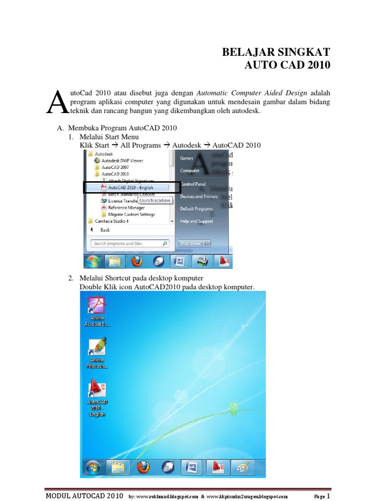 A. Membuka Program AutoCAD 2010 1. Melalui Start Menu Klik Start All Programs Autodesk AutoCAD 2010