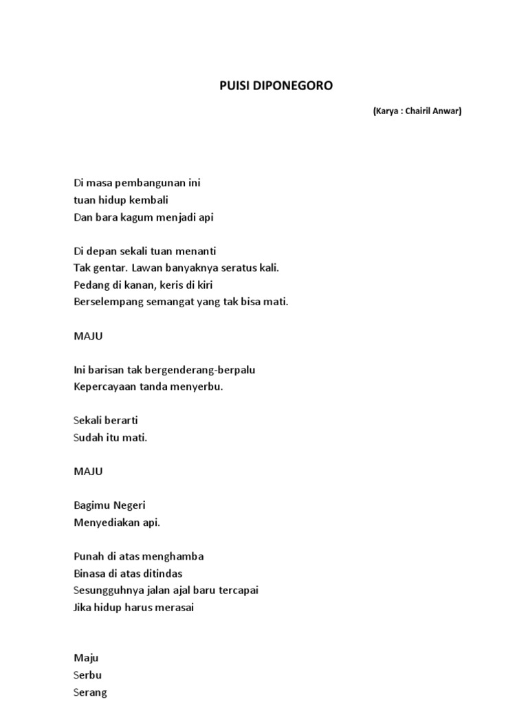 Di masa pembangunan ini tuan hidup kembali Dan bara kagum menjadi api Di depan sekali tuan menanti Tak gentar. Lawan banyaknya seratus kali. Pedang di kanan, keris di kiri Berselempang semangat yang tak bisa mati. MAJU Ini barisan tak bergenderang-berpalu Kepercayaan tanda menyerbu. Sekali berarti Sudah itu mati. MAJU Bagimu Negeri Menyediakan api. Punah di atas menghamba Binasa di atas ditindas Sesungguhnya jalan ajal baru tercapai Jika hidup harus merasai