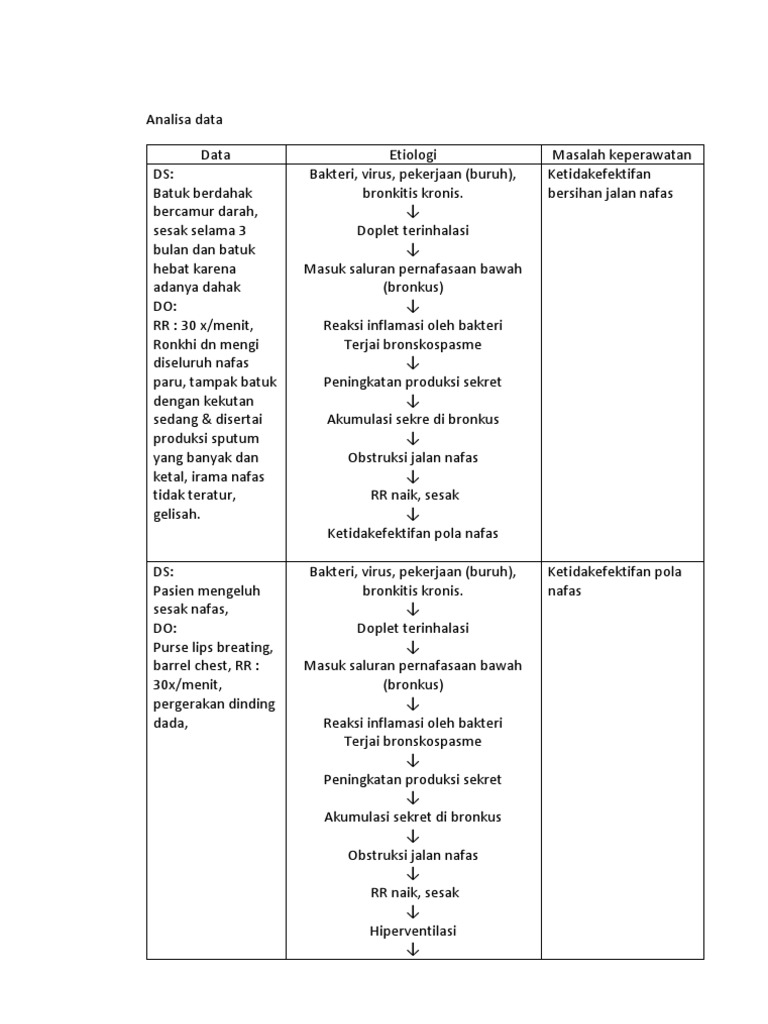Analisa data Data DS: Batuk berdahak bercamur darah, sesak selama 3 bulan dan batuk hebat karena