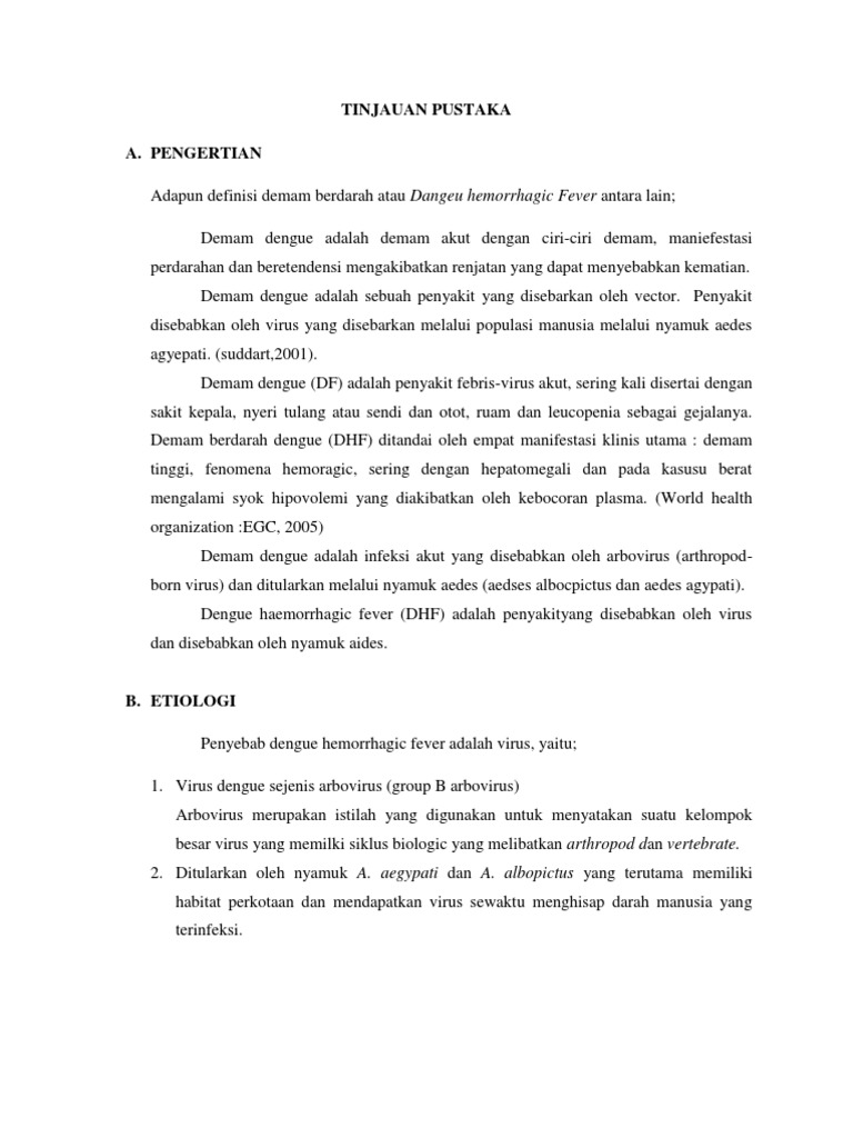 PENGERTIAN Adapun definisi demam berdarah atau Dangeu hemorrhagic Fever antara lain; Demam dengue adalah demam akut dengan ciri-ciri demam, maniefestasi perdarahan dan beretendensi mengakibatkan renjatan yang dapat menyebabkan kematian. Demam dengue adalah sebuah penyakit yang disebarkan oleh vector. Penyakit disebabkan oleh virus yang disebarkan melalui populasi manusia melalui nyamuk aedes agyepati. (suddart,2001). Demam dengue (DF) adalah penyakit febris-virus akut, sering kali disertai dengan sakit kepala, nyeri tulang atau sendi dan otot, ruam dan leucopenia sebagai gejalanya. Demam berdarah dengue (DHF) ditandai oleh empat manifestasi klinis utama : demam tinggi, fenomena hemoragic, sering dengan hepatomegali dan pada kasusu berat mengalami syok hipovolemi yang diakibatkan oleh kebocoran plasma. (World health organization :EGC, 2005) Demam dengue adalah infeksi akut yang disebabkan oleh arbovirus (arthropodborn virus) dan ditularkan melalui nyamuk aedes (aedses albocpictus dan aedes agypati). Dengue haemorrhagic fever (DHF) adalah penyakityang disebabkan oleh virus dan disebabkan oleh nyamuk aides.