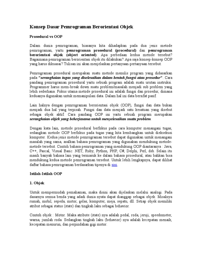 Prosedural vs OOP Dalam dunia pemrograman, biasanya kita dihadapkan pada dua jenis metode pemrograman, yaitu pemrograman prosedural (procedural) dan pemrograman berorientasi objek (object oriented). Apa perbedaan kedua metode tersebut? Bagaimana pemrograman berorientasi objek itu dilakukan? Apa saja konsep-konsep OOP yang harus dikuasai? Tulisan ini akan menjelaskan pertanyaan-pertanyaan tersebut. Pemrograman prosedural merupakan suatu metode menulis program yang didasarkan pada "serangkaian tugas yang diselesaikan dalam bentuk fungsi atau prosedur" . Cara pandang pemrograman prosedural yaitu sebuah program adalah suatu urutan instruksi. Programmer harus mem-break down suatu problem/masalah menjadi sub problem yang lebih sederhana. Fokus utama metode prosedural ini adalah fungsi dan prosedur, dimana keduanya digunakan untuk memanipulasi data. Dalam hal ini data bersifat pasif. Lain halnya dengan pemrograman berorientasi objek (OOP), fungsi dan data bukan menjadi dua hal yang terpisah. Fungsi dan data menjadi satu kesatuan yang disebut sebagai objek aktif. Cara pandang OOP ini yaitu sebuah program merupakan serangkaian objek yang bekerjasama untuk menyelesaikan suatu problem. Dengan kata lain, metode prosedural berfokus pada cara komputer menangani tugas, sedangkan metode OOP berfokus pada tugas yang kita kembangkan untuk dieksekusi komputer. Kedua jenis metode pemrograman tersebut dapat digunakan untuk menangani masalah yang sama, asalkan bahasa pemrograman yang digunakan mendukung metodemetode tersebut. Contoh bahasa pemrograman yang mendukung OOP diantaranya : Java, C++, Pascal, Visual Basic .NET, Ruby, Python, PHP, C#, Delphi, Perl, dsb. Selain itu masih banyak bahasa lain yang termasuk ke dalam bahasa prosedural, atau bahkan bisa mendukung kedua metode pemrograman tersebut. Untuk lebih lengkapnya, dapat dilihat daftar bahasa pemrograman berdasarkan tipenya di sini. Istilah-Istilah OOP 1. Objek Untuk mempermudah pemahaman, maka disini akan dijelaskan melalui analogi. Pada dasarnya semua benda yang adadi dunia nyata dapat dianggap sebagai objek. Misalnya rumah, mobil, sepeda, motor, gelas, komputer, meja, sepatu, dll. Setiap objek memiliki atribut sebagai status (state) dan tingkah laku sebagai behavior. Contoh objek : Motor. Maka atribute (state) nya adalah pedal, roda, jeruji, speedometer, warna, jumlah roda. Sedangkan tingkah laku (behavior) nya adalah kecepatan menaik, kecepatan menurun, dan perpindahan gigi motor.