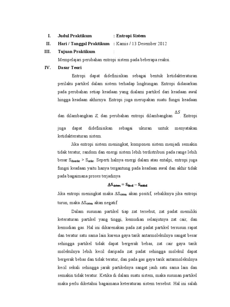 Hari / Tanggal Praktikum : Kamis / 13 Desember 2012 Mempelajari perubahan entropi sistem pada beberapa reaksi. Entropi dapat didefinisikan sebagai bentuk ketidakteraturan perilaku partikel dalam sistem terhadap lingkungan. Entropi didasarkan pada perubahan setiap keadaan yang dialami partikel dari keadaan awal hingga keadaan akhirnya. Entropi juga merupakan suatu fungsi keadaan dan dilambangkan S, dan perubahan entropi dilambangkan juga dapat didefinisikan sebagai ukuran untuk . Entropi menyatakan