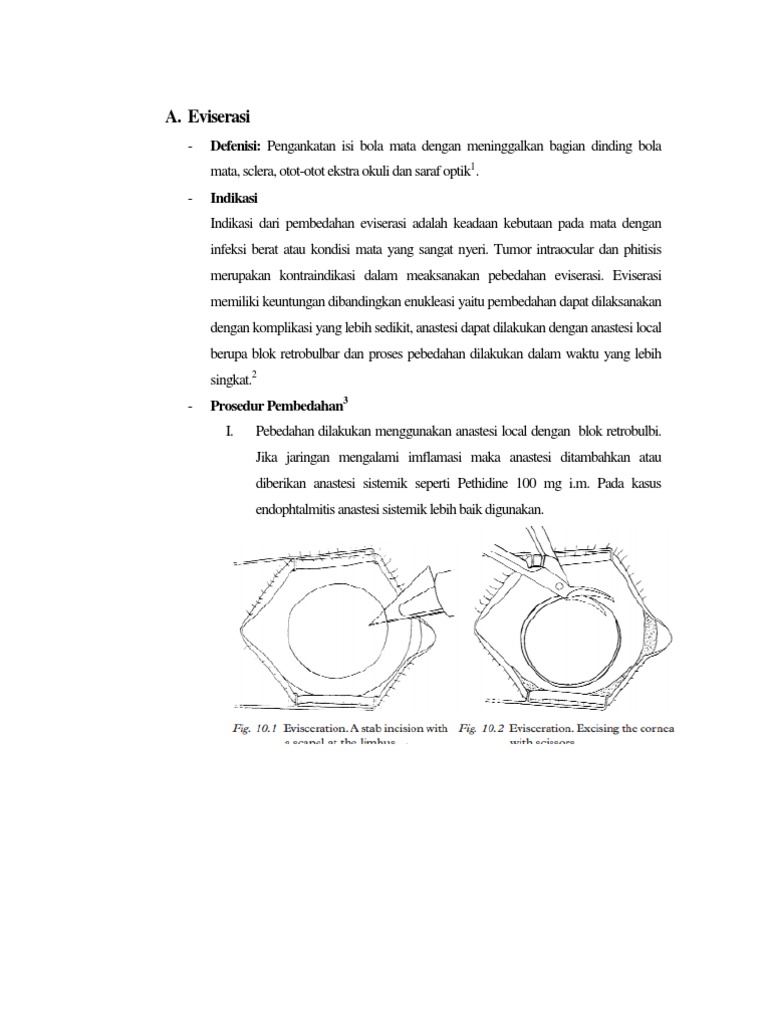 Defenisi: Pengankatan isi bola mata dengan meninggalkan bagian dinding bola mata, sclera, otot-otot ekstra okuli dan saraf optik1. Indikasi Indikasi dari pembedahan eviserasi adalah keadaan kebutaan pada mata dengan infeksi berat atau kondisi mata yang sangat nyeri. Tumor intraocular dan phitisis merupakan kontraindikasi dalam meaksanakan pebedahan eviserasi. Eviserasi memiliki keuntungan dibandingkan enukleasi yaitu pembedahan dapat dilaksanakan dengan komplikasi yang lebih sedikit, anastesi dapat dilakukan dengan anastesi local berupa blok retrobulbar dan proses pebedahan dilakukan dalam waktu yang lebih singkat.2 Prosedur Pembedahan3 I. Pebedahan dilakukan menggunakan anastesi local dengan blok retrobulbi. Jika jaringan mengalami imflamasi maka anastesi ditambahkan atau diberikan anastesi sistemik seperti Pethidine 100 mg i.m. Pada kasus endophtalmitis anastesi sistemik lebih baik digunakan.