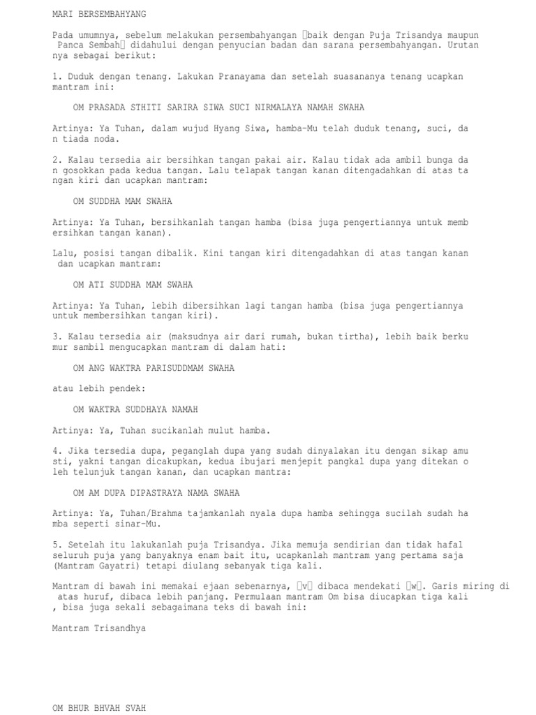 dengan penyucian badan dan sarana persembahyangan. Urutan nya sebagai berikut: 1. Duduk dengan tenang. Lakukan Pranayama dan setelah suasananya tenang ucapkan mantram ini: OM PRASADA STHITI SARIRA SIWA SUCI NIRMALAYA NAMAH SWAHA Artinya: Ya Tuhan, dalam wujud Hyang Siwa, hamba-Mu telah duduk tenang, suci, da n tiada noda. 2. Kalau tersedia air bersihkan tangan pakai air. Kalau tidak ada ambil bunga da n gosokkan pada kedua tangan. Lalu telapak tangan kanan ditengadahkan di atas ta ngan kiri dan ucapkan mantram: OM SUDDHA MAM SWAHA Artinya: Ya Tuhan, bersihkanlah tangan hamba (bisa juga pengertiannya untuk memb ersihkan tangan kanan). Lalu, posisi tangan dibalik. Kini tangan kiri ditengadahkan di atas tangan kanan dan ucapkan mantram: OM ATI SUDDHA MAM SWAHA Artinya: Ya Tuhan, lebih dibersihkan lagi tangan hamba (bisa juga pengertiannya untuk membersihkan tangan kiri). 3. Kalau tersedia air (maksudnya air dari rumah, bukan tirtha), lebih baik berku mur sambil mengucapkan mantram di dalam hati: OM ANG WAKTRA PARISUDDMAM SWAHA atau lebih pendek: OM WAKTRA SUDDHAYA NAMAH Artinya: Ya, Tuhan sucikanlah mulut hamba. 4. Jika tersedia dupa, peganglah dupa yang sudah dinyalakan itu dengan sikap amu sti, yakni tangan dicakupkan, kedua ibujari menjepit pangkal dupa yang ditekan o leh telunjuk tangan kanan, dan ucapkan mantra: OM AM DUPA DIPASTRAYA NAMA SWAHA Artinya: Ya, Tuhan/Brahma tajamkanlah nyala dupa hamba sehingga sucilah sudah ha mba seperti sinar-Mu. 5. Setelah itu lakukanlah puja Trisandya. Jika memuja sendirian dan tidak hafal seluruh puja yang banyaknya enam bait itu, ucapkanlah mantram yang pertama saja (Mantram Gayatri) tetapi diulang sebanyak tiga kali. Mantram di bawah ini memakai ejaan sebenarnya, v dibaca mendekati w . Garis miring di atas huruf, dibaca lebih panjang. Permulaan mantram Om bisa diucapkan tiga kali , bisa juga sekali sebagaimana teks di bawah ini: Mantram Trisandhya