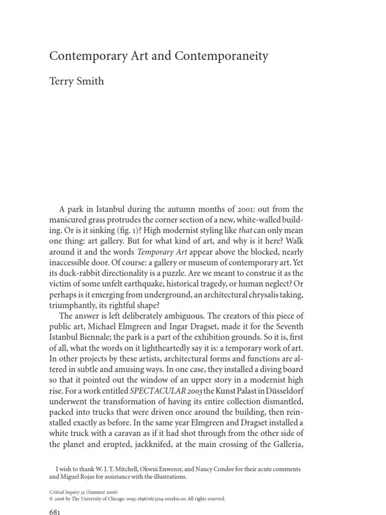 30 It is inspiring. “The Provincialism Problem.” Artforum 13 (Sept. in the artworks highlighted here. 1974): 54–59. See Smith.Critical Inquiry / Summer 2006 707 issued from the power centers and the struggling multiplicity emergent from everywhere else cannot do so either. has been transformed by a larger network of widely dispersed and variously connected sources of creative coping. and even more challenging. more and more insights into adaptable modes of active resistance and hopeful persistence. to be able to see that this system. Just over thirty years ago I described the international art system as still centered. A less salutary. on the New York artworld. now. 30. aspect of contemporaneity is the world (dis)order in which this productivity subsists. however much it strives to concentrate its power. . The rich complexities of contemporaneity have set the world’s agenda since the end of the cold war. however precariously and debilitatingly. Yet sprinkled amidst the recursion to past and fantastical styles of security we have seen. creating a nearly universal condition of permanent-seeming aftermath—Ground Zero everywhere.