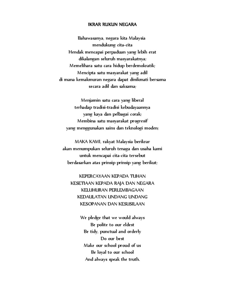 dikalangan seluruh masyarakatnya; Memelihara satu cara hidup berdemokratik; Mencipta satu masyarakat yang adil di mana kemakmuran negara dapat dinikmati bersama secara adil dan saksama; Menjamin satu cara yang liberal terhadap tradisi-tradisi kebudayaannya yang kaya dan pelbagai corak; Membina satu masyarakat progresif yang menggunakan sains dan teknologi moden; MAKA KAMI, rakyat Malaysia berikrar akan menumpukan seluruh tenaga dan usaha kami untuk mencapai cita-cita tersebut berdasarkan atas prinsip prinsip yang berikut; KEPERCAYAAN KEPADA TUHAN KESETIAAN KEPADA RAJA DAN NEGARA KELUHURAN PERLEMBAGAAN KEDAULATAN UNDANG UNDANG KESOPANAN DAN KESUSILAAN We pledge that we would always Be polite to our eldest Be tidy, punctual and orderly Do our best Make our school proud of us Be loyal to our school And always speak the truth.