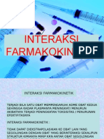 INTERAKSI FARMAKOKINETIK Semua proses farmakokinetik, yaitu absorpsi, distribusi, metabolisme, dan ekskresi, dapat dipengaruhi oleh obat. Absorpsi Absorpsi obat dari traktus gastrointestinalis dipengaruhi oleh senyawa : yang mengikat obat o antasida: menurunkan absorpsi GIT digoxin, ketoconazole, antibiotik quinolone, dan tetracycline. o erythromycin meningkatkan bioavailabilitas oral digoxin, dengan cara menurunkan flora usus yang men-degradasi digoxin. o makanan yang tinggi kalsium dengan tetracycline akan membentuk senyawa kompleks yang tidak bisa diabsorpsi o zat besi dengan teh o colestyramine (bile acidbinding resin - untuk terapi hypercholesterolaemia) mengikat warfarin dan digoxin sehingga tidak di-absorpsi. yang meningkatkan (metoclopramide) atau menurunkan (antimuskarinik atropine, opiate) motilitas gastrointestinal Senyawa dalam jus anggur dan obat yang meng-inhibisi Pglycoprotein transporter obat pada intestinal epithelium, dapat meningkatkan absorpsi obat yang menjalani proses ini. Interaksi lain: penambahan adrenaline (epinephrine) pada injeksi anestesi lokal: menyebabkan