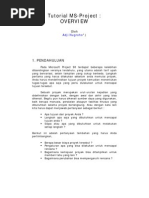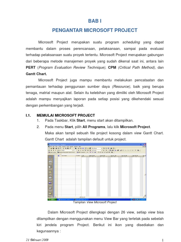 Microsoft Project merupakan suatu program scheduling yang dapat membantu dalam proses perencanaan, pelaksanaan, sampai pada evaluasi terhadap pelaksanaan suatu proyek tertentu. Microsoft Project merupakan gabungan dari beberapa metode manajemen proyek yang sudah dikenal saat ini, antara lain PERT (Program Evaluation Review Technique), CPM (Critical Path Method), dan Gantt Chart. Microsoft Project juga mampu membantu melakukan pencataatan dan pemantauan terhadap penggunaan sumber daya (Resource), baik yang berupa tenaga, matrial maupun alat. Selain itu kelebihan yang dimiliki oleh Microsoft Project adalah mampu menyajikan laporan pada setiap posisi yang dikehendaki sesuai dengan perkembangan yang terjadi. I.1. MEMULAI MICROSOFT PROJECT 1. Pada Taskbar, Klik Start, menu start akan ditampilkan. 2. Pada menu Start, pilih All Programs, lalu klik Microsoft Project. Maka akan tampil sebuah file project kosong dalam view Gantt Chart. Gantt Chart adalah tampilan default untuk project.