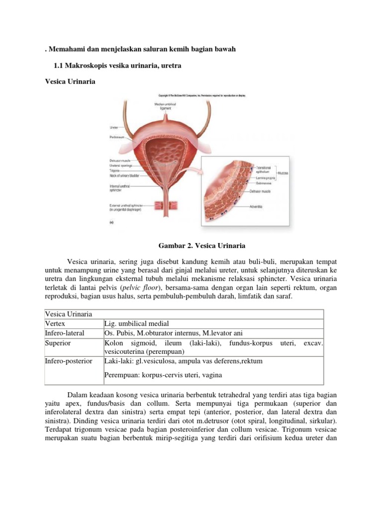 1.2 Mikroskopis traktus urinarius Vesica Urinaria Terdiri dari epitel transisional, di bawah epitel terdapat muskularis mukosa yg tidak utuh yang di bentuk oleh serat otot kecil yg tidak beraturan, dan banyak serat saraf. Lamina propianya tebal denga lapis luar yang longgar. Tunika muskularisnya terdiri dari 3 lapisan :