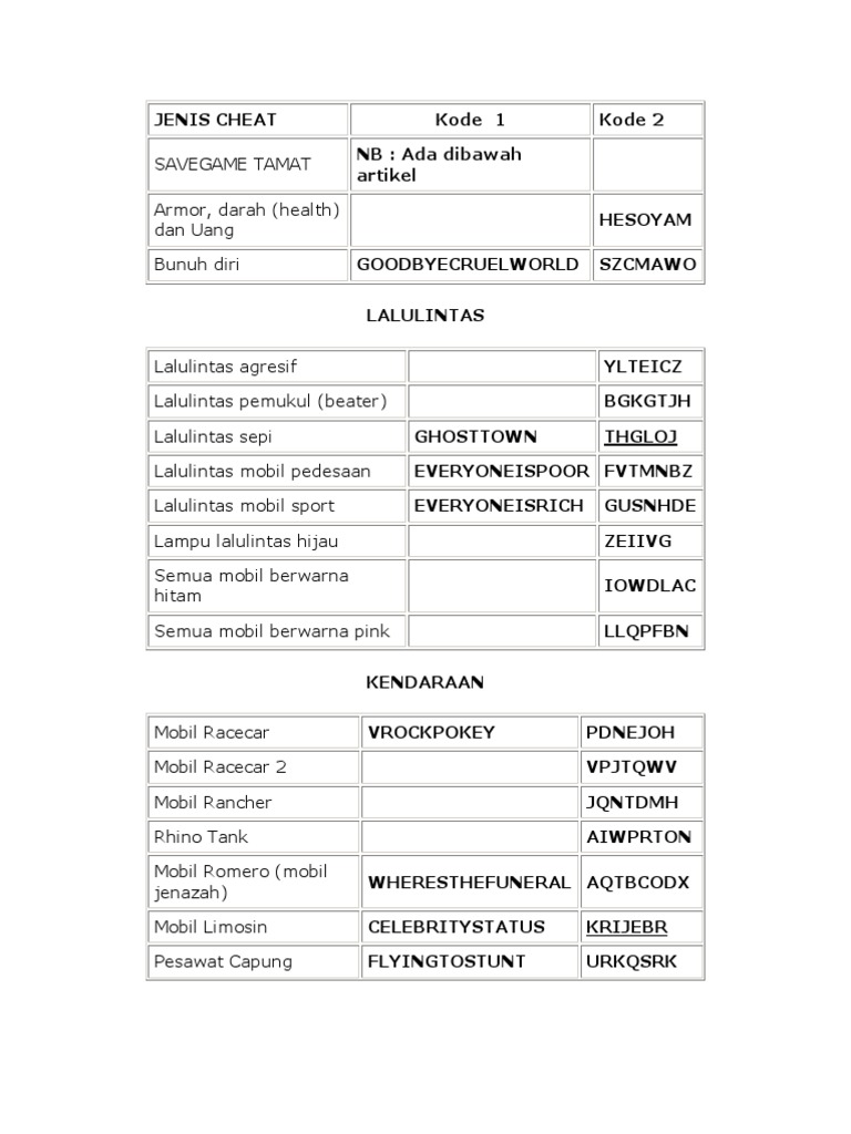 Catatan : "Mobil Air" dan "Pimping missions completed" code tidak tersedia di GTA San Andreas versi PC. SaveGame tamat GTA San Andreas ini khusus untuk kalian yang sudah tidak ingin bermain dengan misi-misi yang sulit dan ingin sekedar main bebas saja. SaveGame GTA San Andreas ini sudah tamat 100% jadi tidak ada lagi misi yang di jalankan.