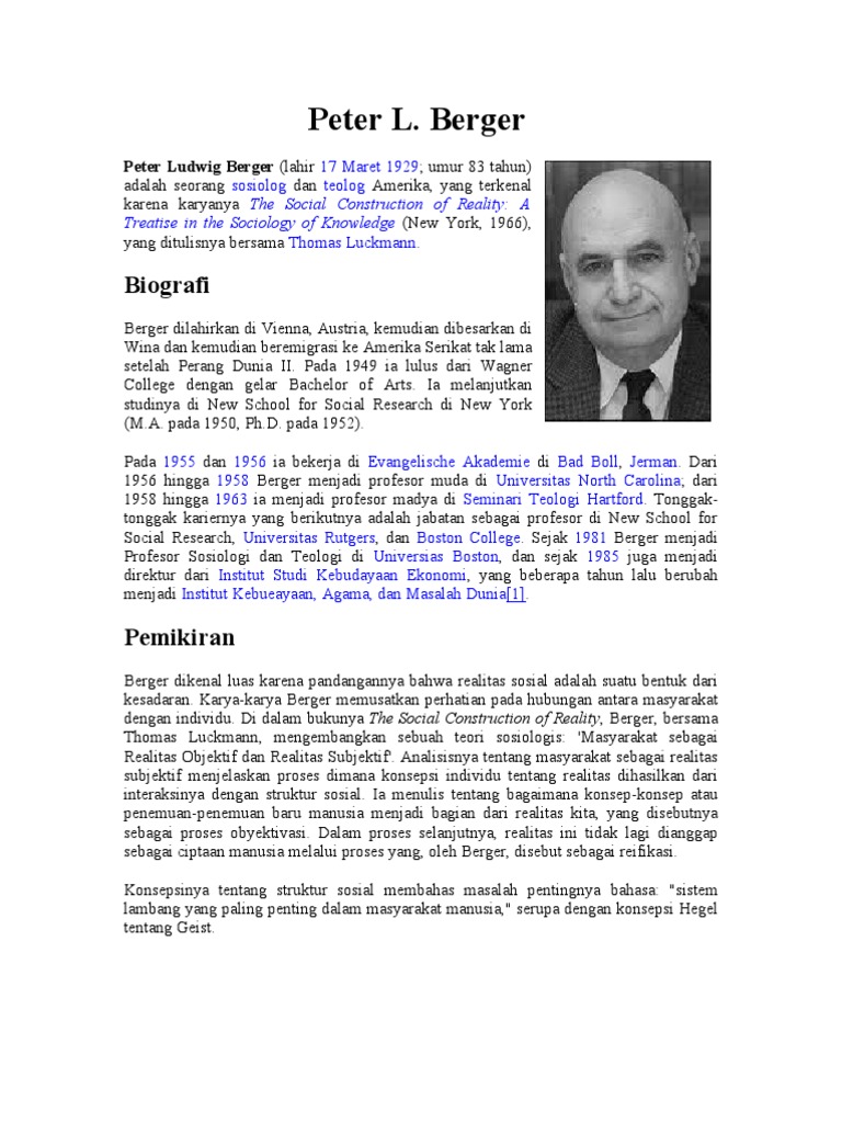 Invitation to Sociology: A Humanistic Perspective (1963) (bahasa Indonesia: Humanisme Sosiologi, Inti Sarana Aksara, Jakarta, 1985) The Social Construction of Reality: A Treatise in the Sociology of Knowledge (1966, dengan Thomas Luckmann) (bahasa Indonesia: Tafsir Sosial atas Kenyataan Risalah tentang Sosiologi Pengetahuan, LP3ES, Jakarta, 1990) The Sacred Canopy: Elements of a Sociological Theory of Religion (1967) (bahasa Indonesia: Langit Suci Agama sebagai Realitas Sosial, LP3ES, Jakarta, 1991) A Rumor of Angels: Modern Society and the Rediscovery of the Supernatural , 1970 (bahasa Indonesia: Kabar Angin Dari Langit: Makna Teologi dalam Masyarakat Modern, LP3ES, Jakarta, 1991)