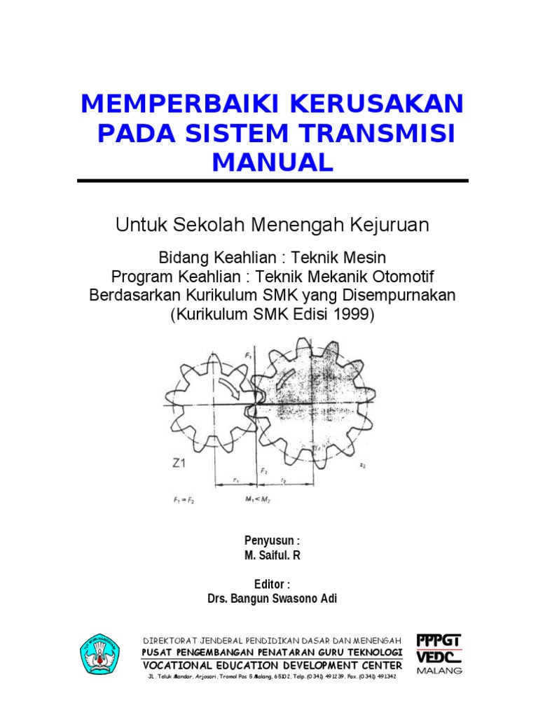Modul ini dibuat untuk menambah wawasan bagi para pembaca serta khasanah ilmu pengetahuan khususnya bidang otomotif. Perkembangan industri otomotif yang ada di Indonesia khususnya akhirakhir ini berkembang dengan pesat, apalagi ditambah dengan masuknya mobilmobil secara CBU (Complete Build Up) ke Indonesia akan menambah ramainya persaingan industri otomotif di Indonesia. Sejalan dengan itu maka kebutuhan tenaga mekanik otomotif semakin bertambah pula baik dari segi kuantitas maupun kualitas supaya didapat mekanik yang berkualitas tentu dituntut pengetahuan dan keterampilan yang handal. Modul ini dibuat untuk menambah wawasan pengetahuan serta keterampilan bagi para pembaca khususnya yang berhubungan dengan sistem transmisi manual. Modul ini berisi mengenai informasi umum sistem transmisi manual, petunjuk pemeriksaan serta perbaikannya sehingga dengan mempelajari modul ini diharapkan dapat memeriksa/mengontrol sistem transmisi manual, menganalisa untuk mencari penyebab gangguan pada sistem transmisi manual serta memperbaikinya. Namun demikian isi modul ini jauh dari sempurna sehingga, kritik atau saran untuk perbaikan modul ini akan selalu diterima dengan senang hati.