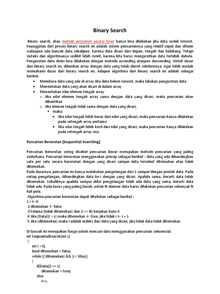 } if(ditemukan) return i; else return -1; } Fungsi diatas akan mengembalikan indeks dari data yang dicari. Apabila data tidak ditemukan maka fungsi diatas akan mengembalikan nilai 1. Pencarian Biner (Binary Search) Salah satu syarat agar pencarian biner dapat dilakukan adalah data sudah dalam keadaan urut. Dengan kata lain, apabila data belum dalam keadaan urut, pencarian biner tidak dapat dilakukan. Dalam kehidupan sehari-hari, sebenarnya kita juga sering menggunakan pencarian biner. Misalnya saat ingin mencari suatu kata dalam kamus Prinsip dari pencarian biner dapat dijelaskan sebagai berikut : mula-mula diambil posisi awal 0 dan posisi akhir = N - 1, kemudian dicari posisi data tengah dengan rumus (posisi awal + posisi akhir) / 2. Kemudian data yang dicari dibandingkan dengan data tengah. Jika lebih kecil, proses dilakukan kembali tetapi posisi akhir dianggap sama dengan posisi tengah 1. Jika lebih besar, porses dilakukan kembali tetapi posisi awal dianggap sama dengan posisi tengah + 1. Demikian seterusnya sampai data tengah sama dengan yang dicari.Untuk lebih jelasnya perhatikan contoh berikut: Misalnya ingin mencari data 17 pada sekumpulan data berikut :