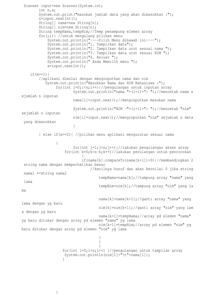 } }else if(x==3){//pilihan menu aplikasi pengurutan berdasarkan nim for(int j=1;j<n;j++){ for(int k=0;k<n-k;k++) { if(nama[k].compareToIgnoreCase(nim[k+1])>0){//membanding kan 2 string nim akan bernilai 0 jika string nim1 ==string nim2 tempNama=nama[k];//tampung array "nama" yang lam a tempNim=nim[k];//tampung array "nim" yang lama nama[k]=nama[k+1];//ganti array "nama" yang lama dengan yg baru nim[k]=nim[k+1];//ganti array "nama" yang lama d engan yg baru nama[k+1]=tempNama;//array pd elemen "nama" yg b aru ditukar dengan array pd elemen "nama" yg lama nim[k+1]=tempNim;//array pd elemen "nim" yg baru ditukar dengan array pd elemen "nim" yg lama } } for(int l=0;l<n;l++) {//pengulangan untuk tampilan array System.out.println(nim[l]+"\t"+nama[l]); } } }else if(x==4){ System.exit(0); //keluar dari menu } } } }